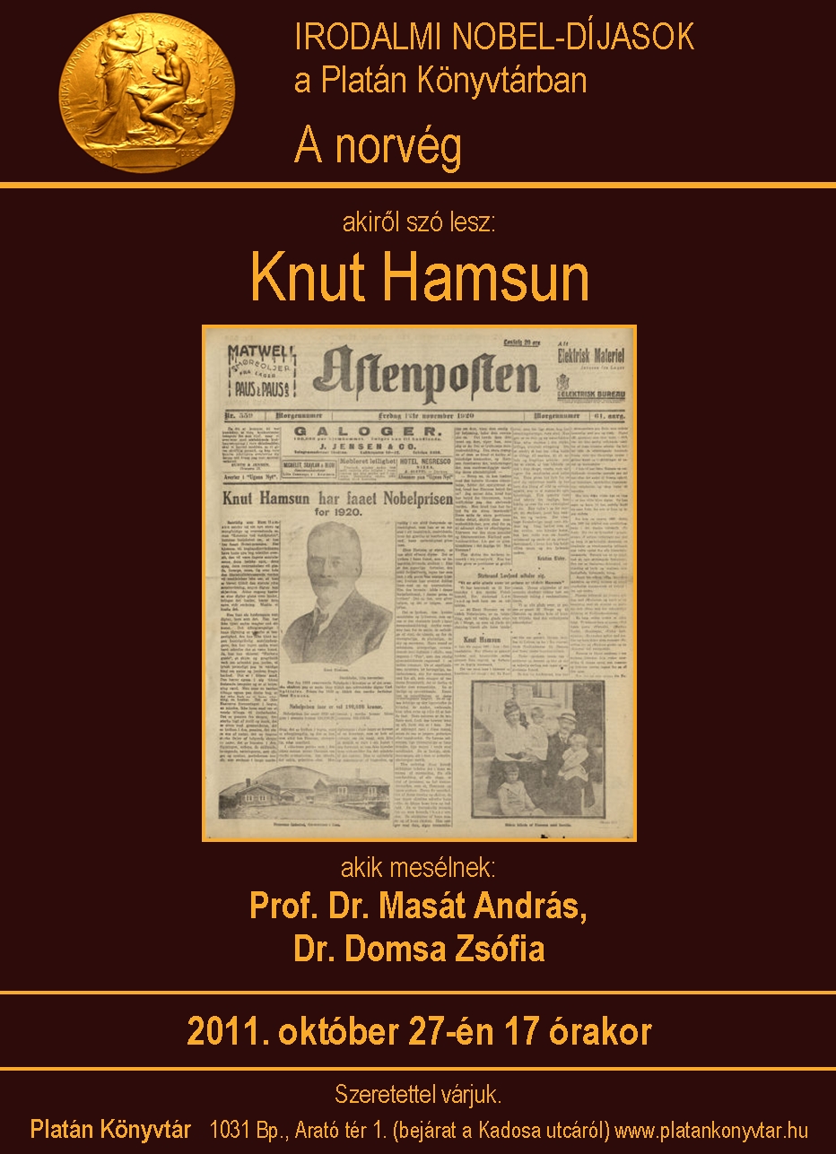 Hamsun, a Nobel-díjas, világszerte ismert norvég író, majd - a 2. világháború után − elítélt náci életútját, műveit és politikai szerepét bemutató előadás körbejárta a „Hamsun jelenséget”. Rámutatott az ellentmondásokra és összefüggésekre, ami a kitűnő irodalmi szövegek alkotója és a zsákutcába vezető politikai szövegek írója között volt.
