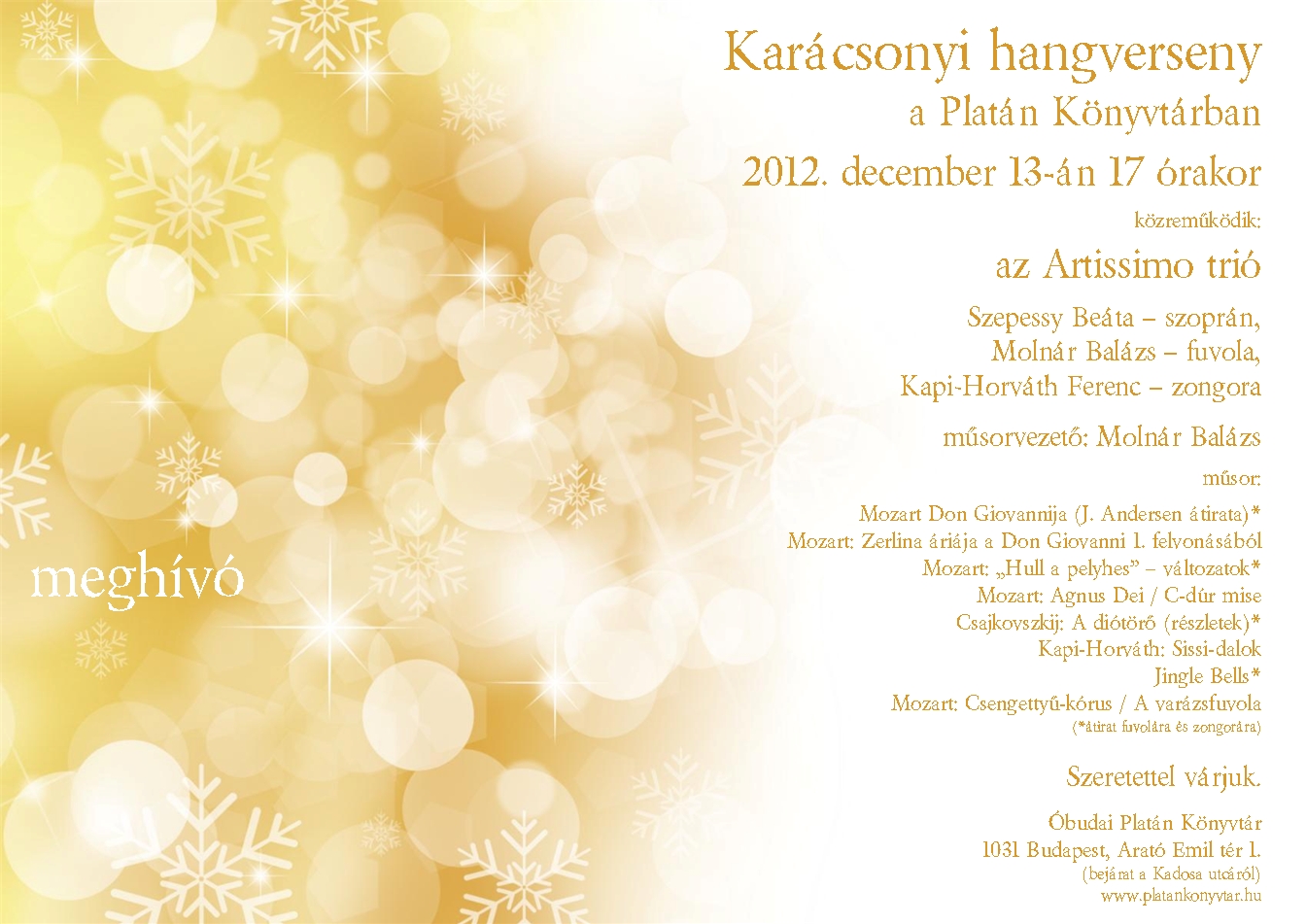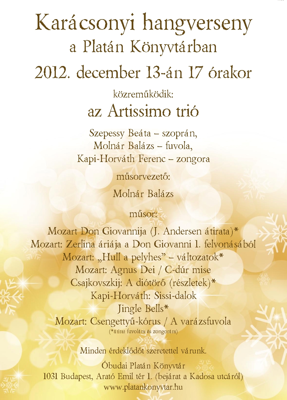 Közreműködik: az Artissimo trió (Szepessy Beáta - szoprán, Molnár Balázs - fuvola, Kapi-Horváth Ferenc - zongora)