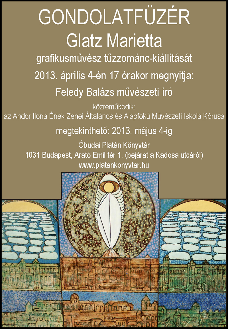 Glatz Marietta grafikusművész tűzzománc-kiállítását 2013. április 4-én megnyitja Feledy Balázs művészeti író Közreműködik: az Andor Ilona Ének - Zenei Általános és Alapfokú Művészeti Iskola Kórusa megtekinthető: 2013. május 4-ig.
