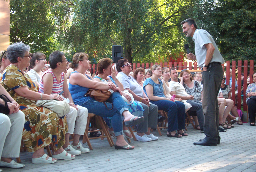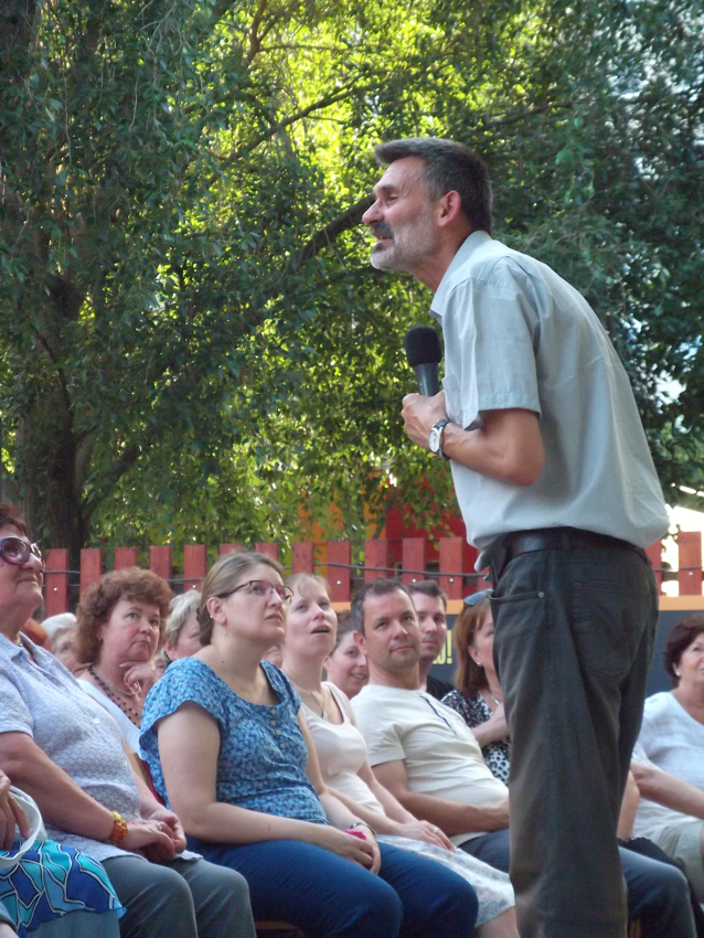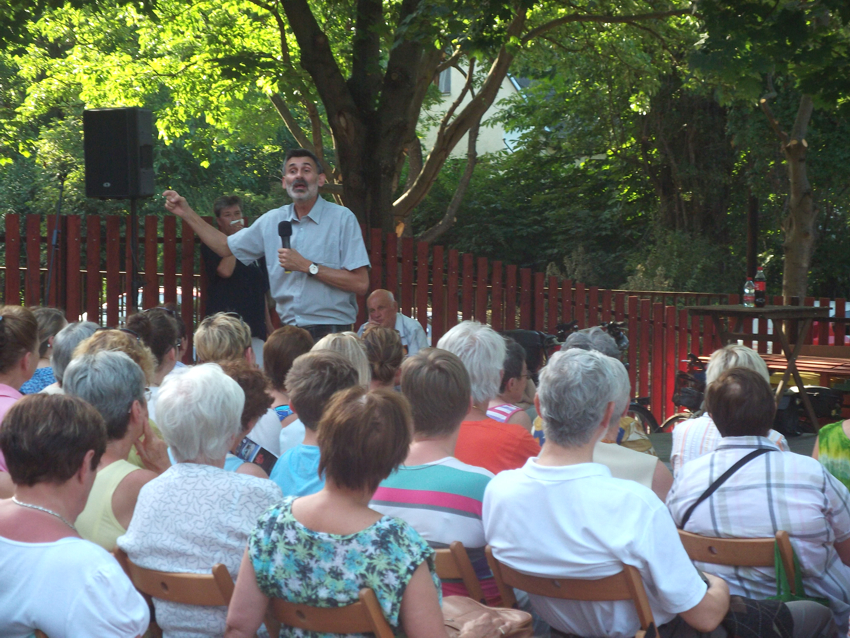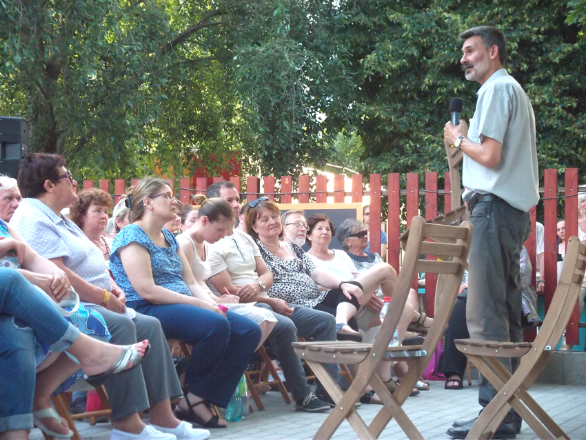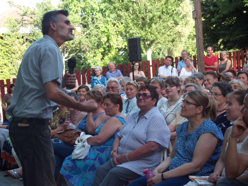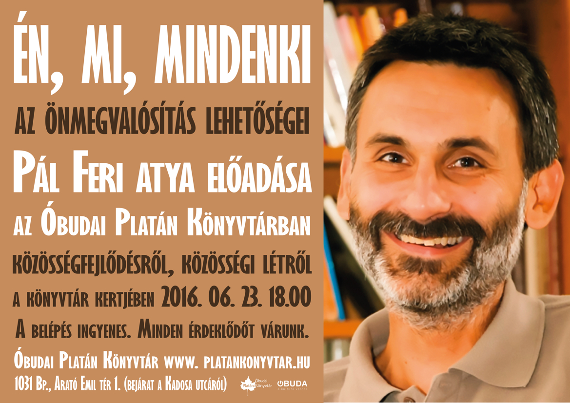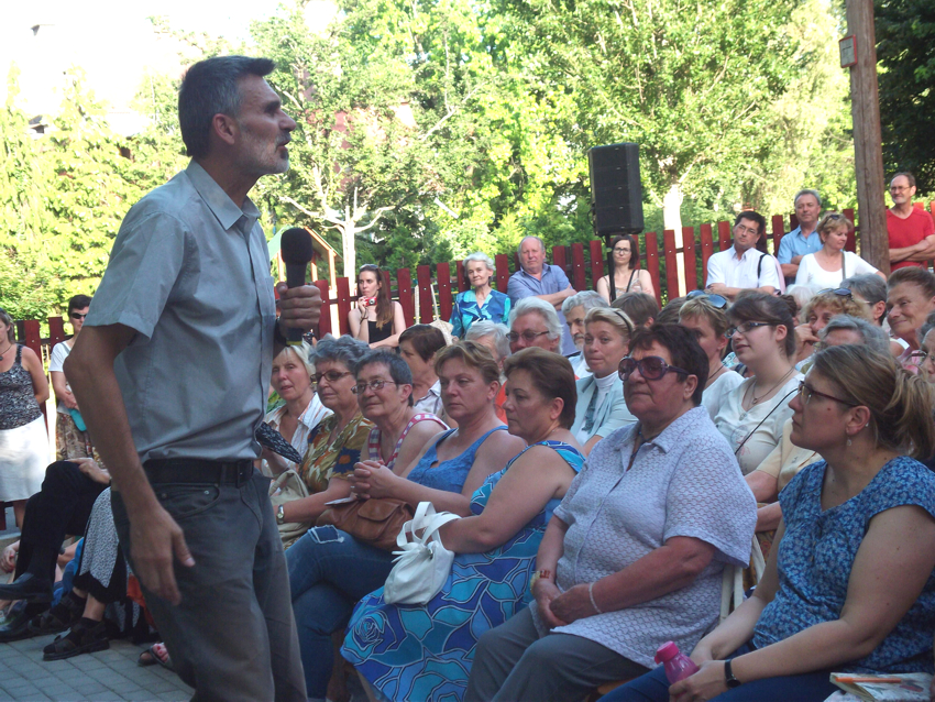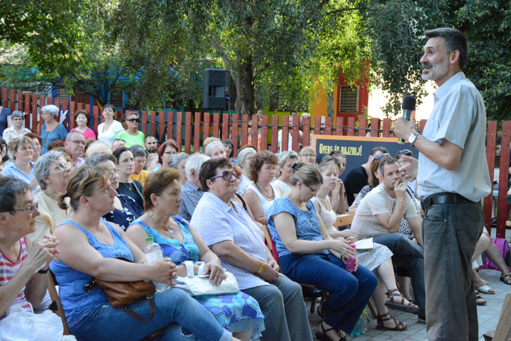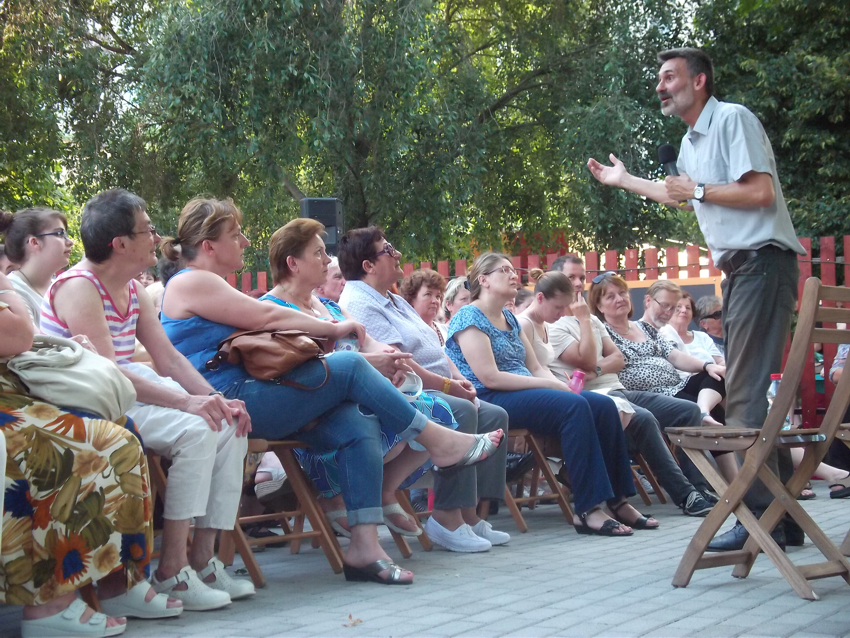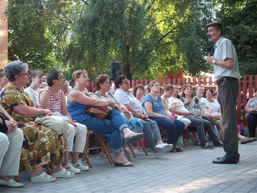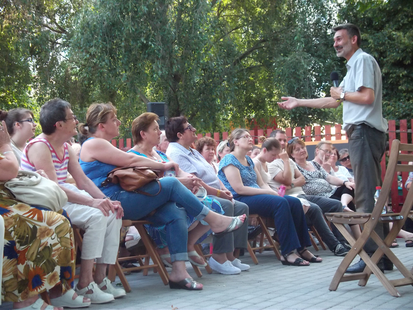 Pál Feri atya előadása közösségfejlődésről, közösségi létről a könyvtár kertjében