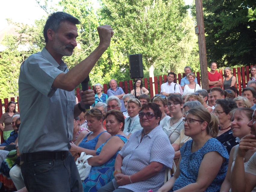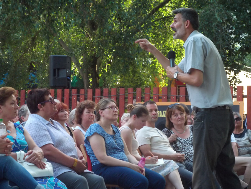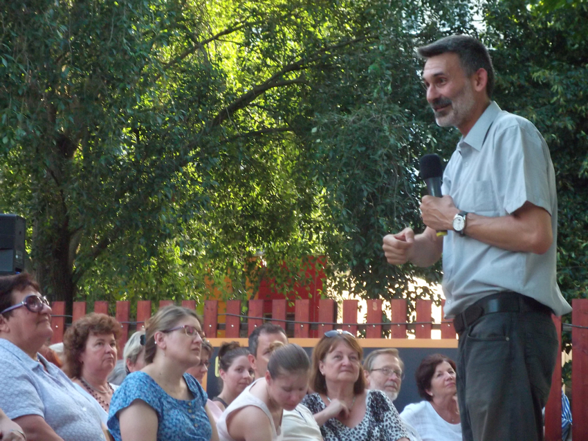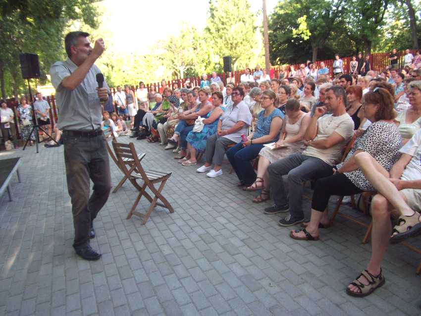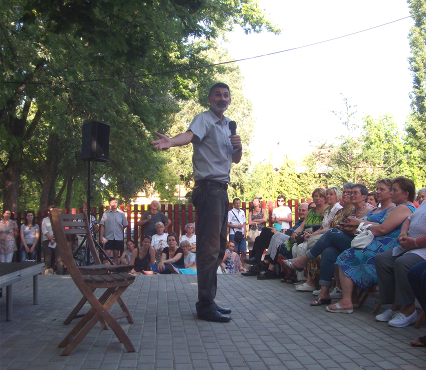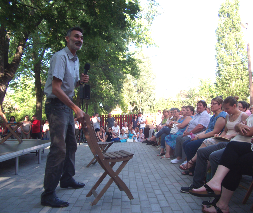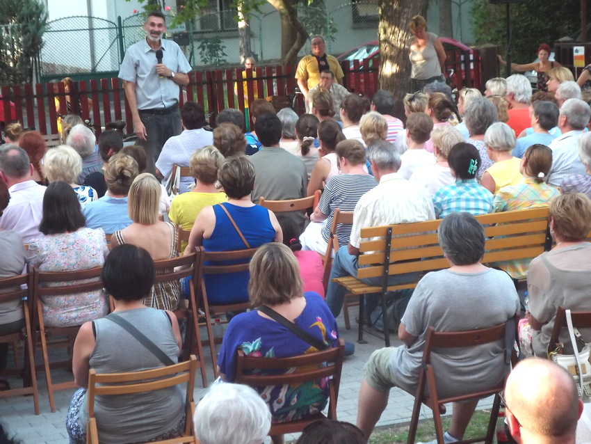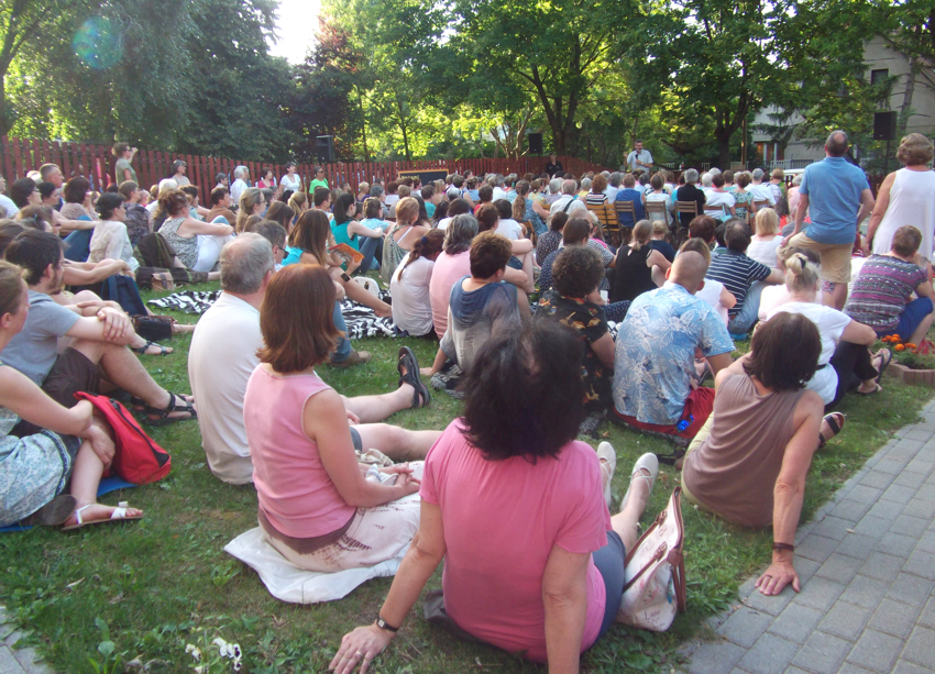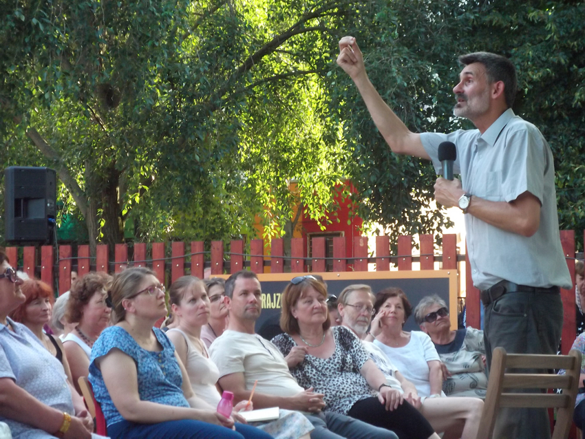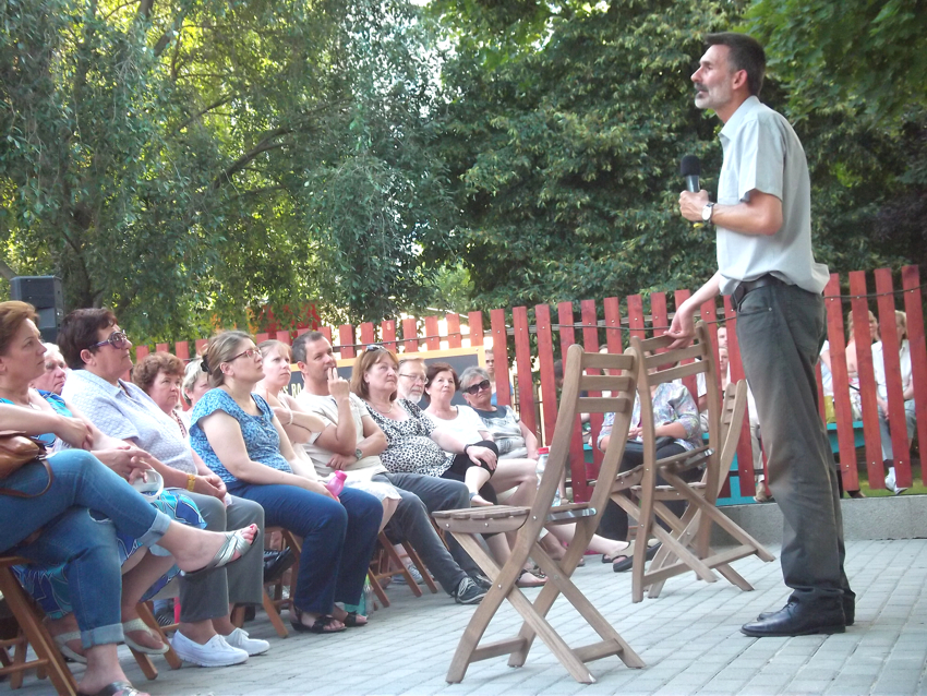 Pál Feri atya előadása közösségfejlődésről, közösségi létről a könyvtár kertjében