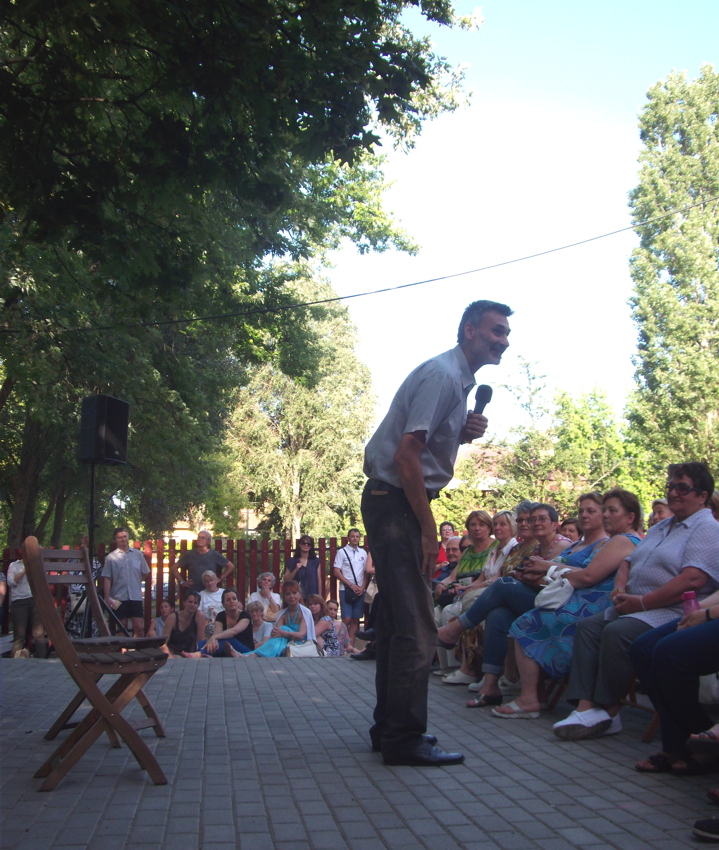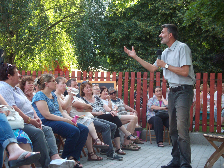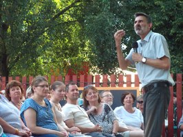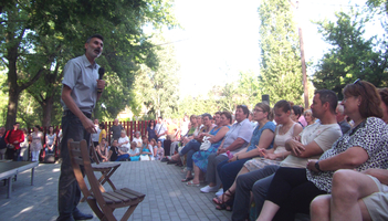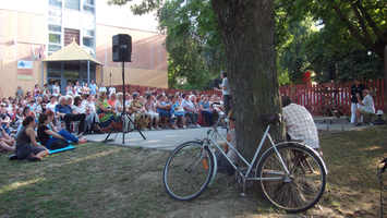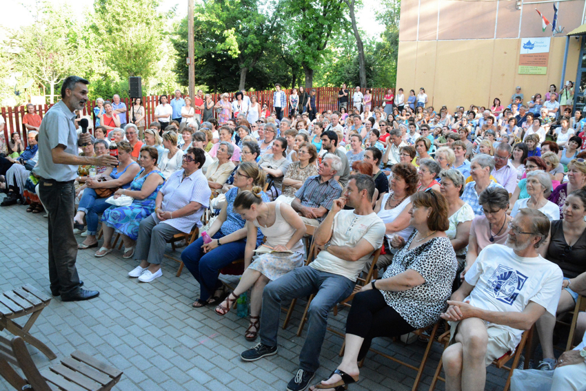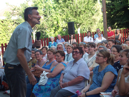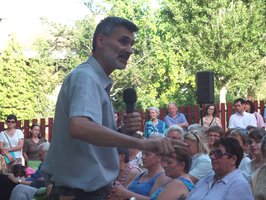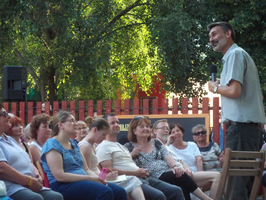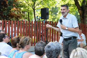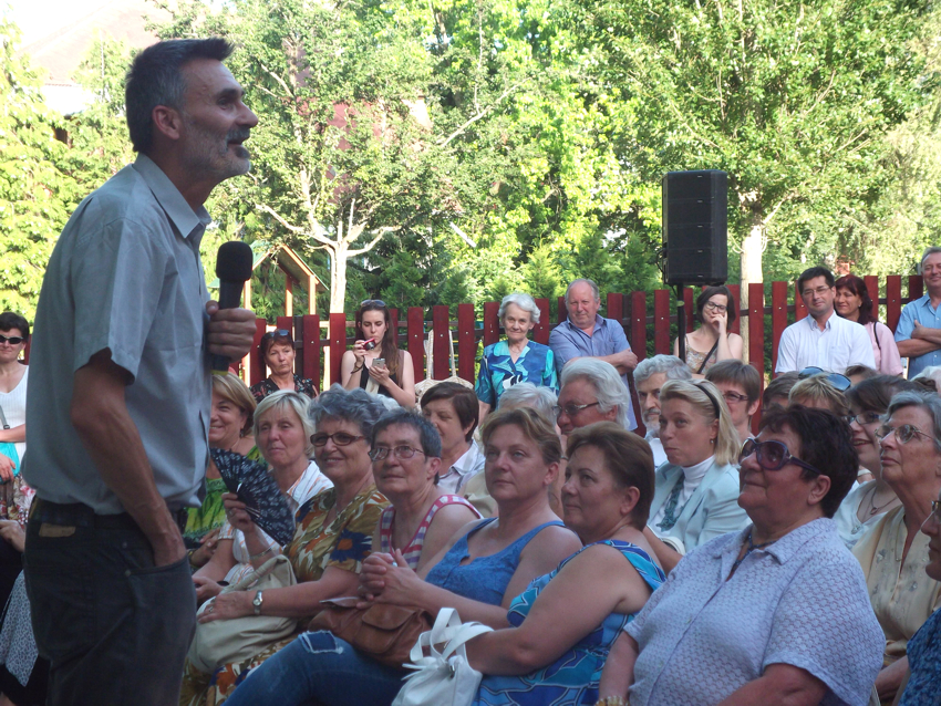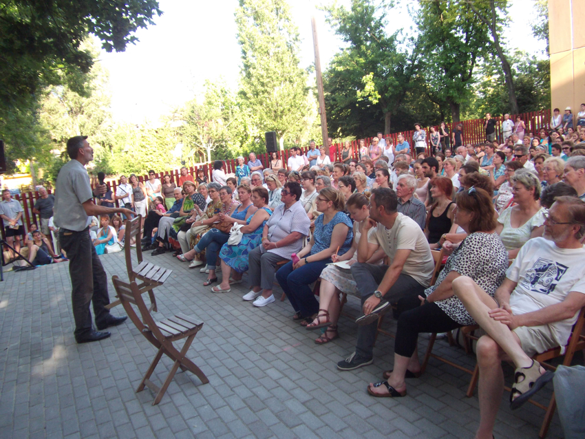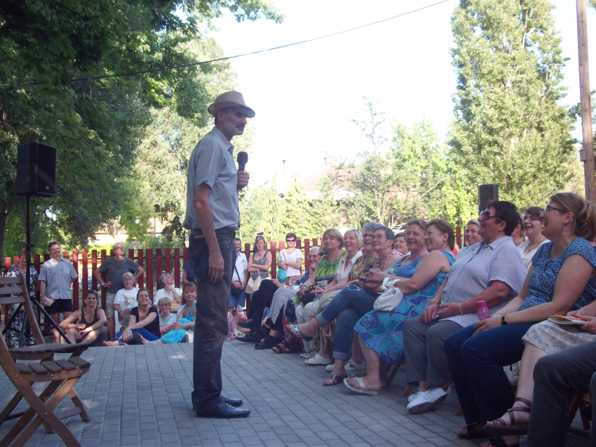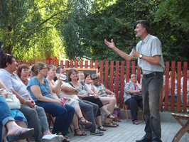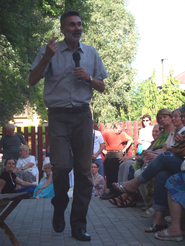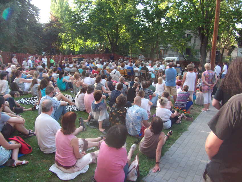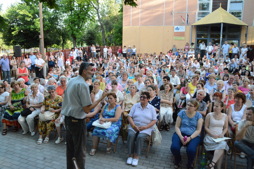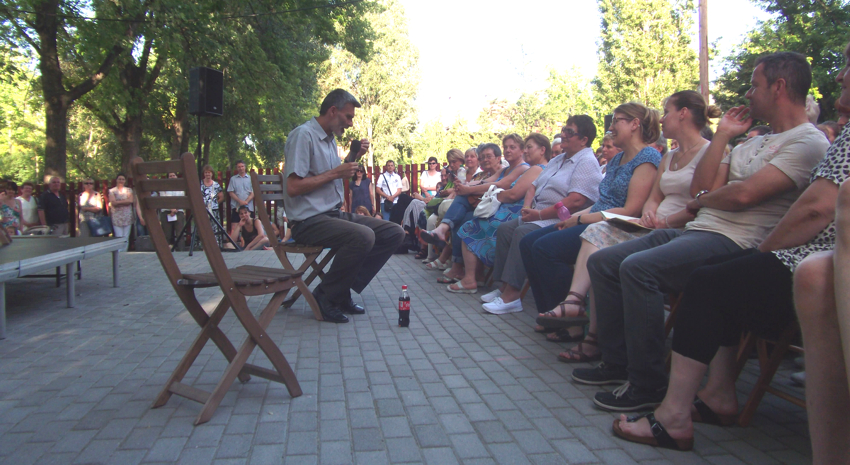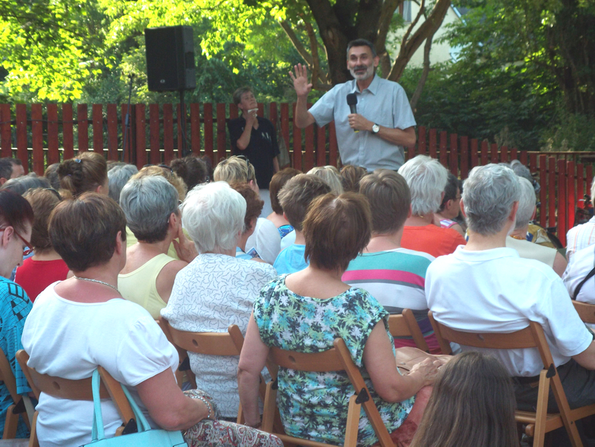 Pál Feri atya előadása közösségfejlődésről, közösségi létről a könyvtár kertjében