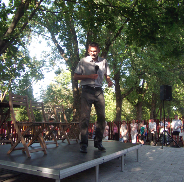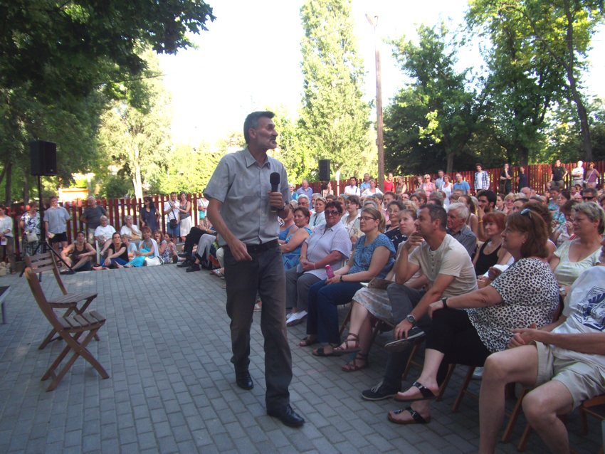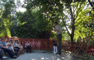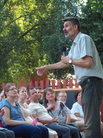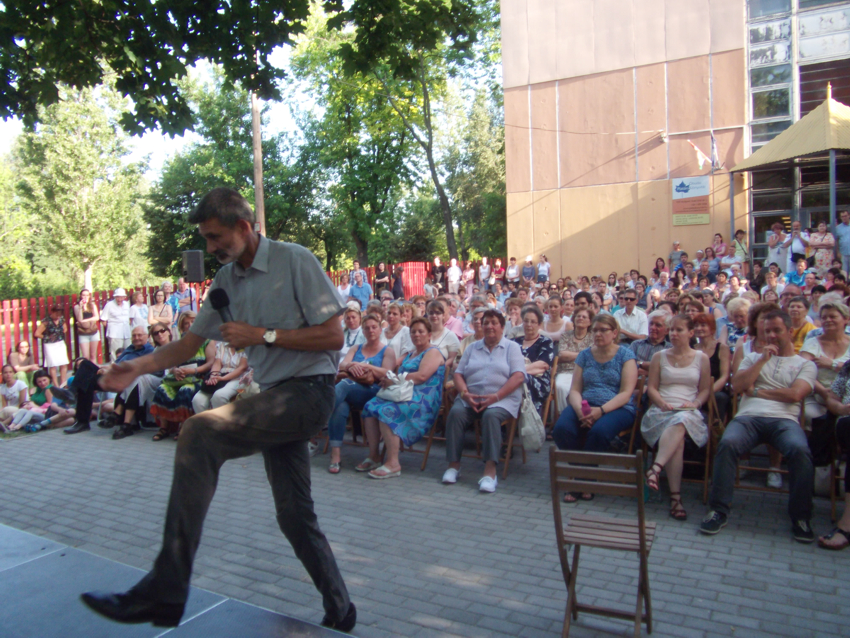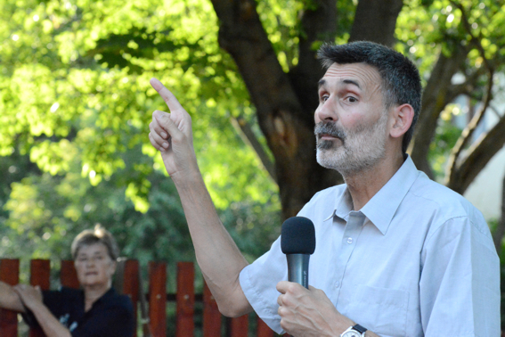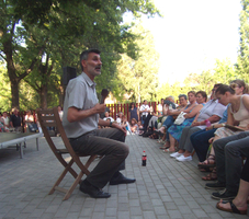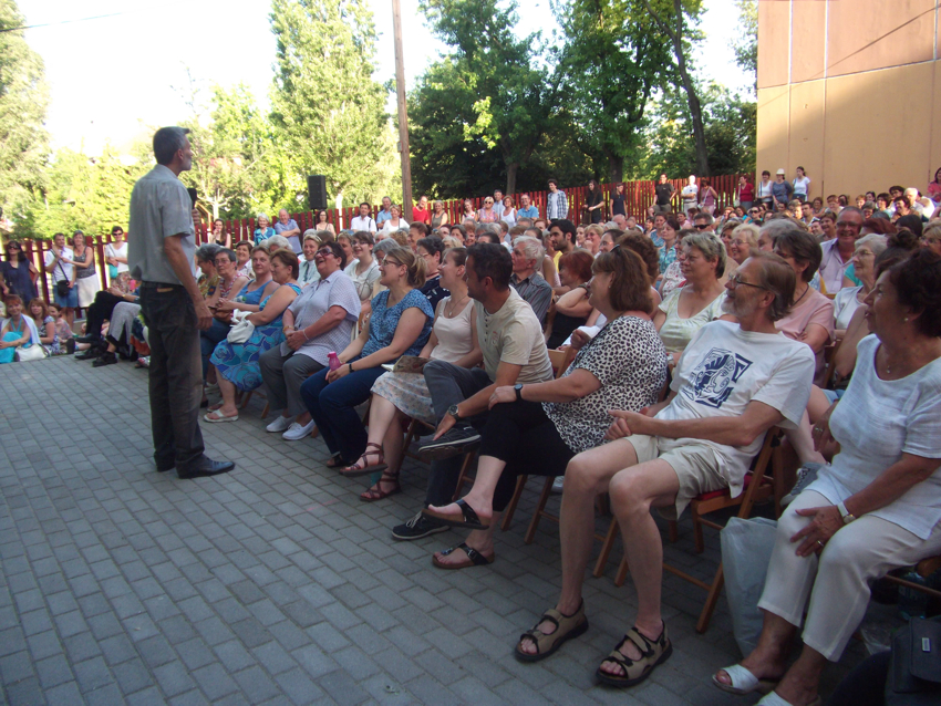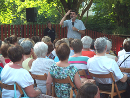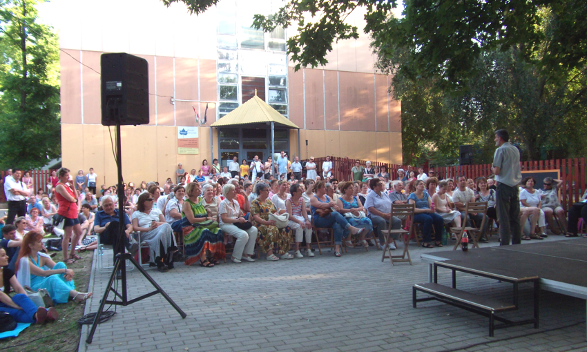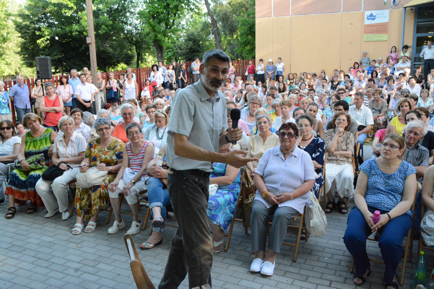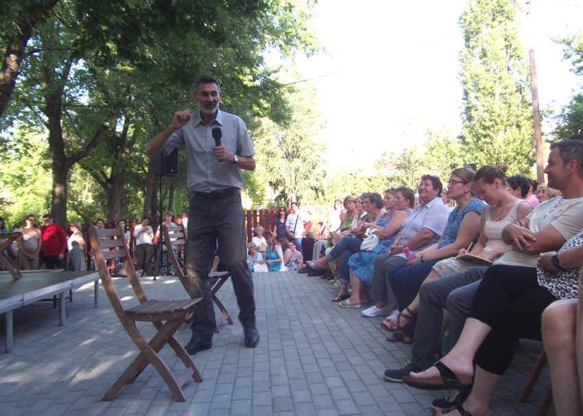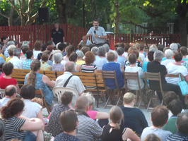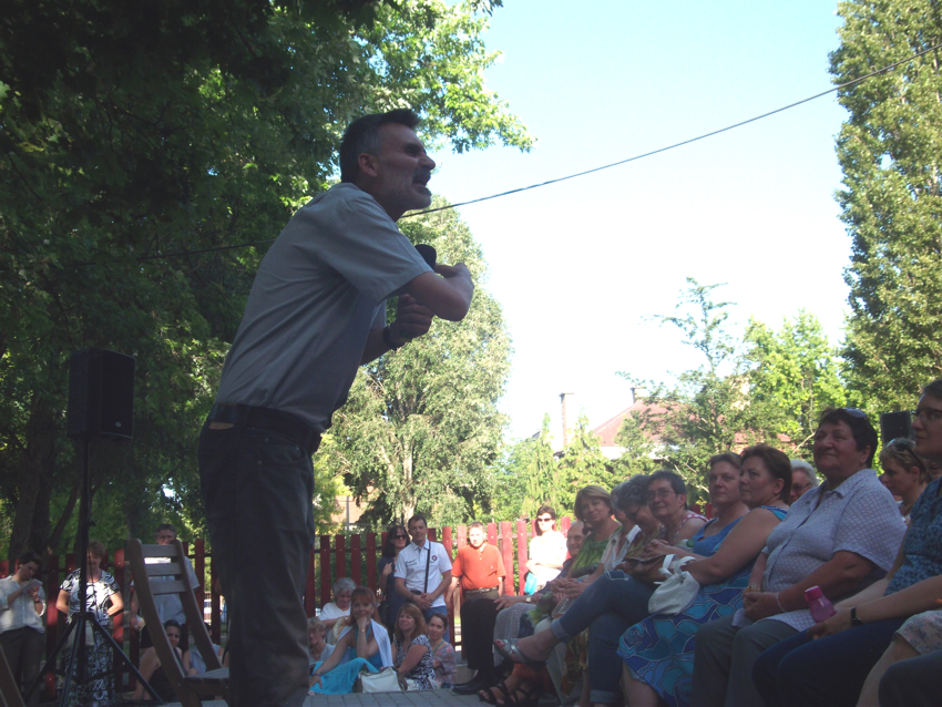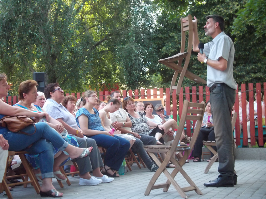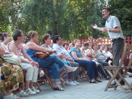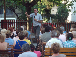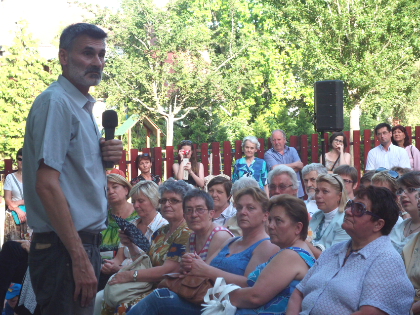 Pál Feri atya előadása közösségfejlődésről, közösségi létről a könyvtár kertjében