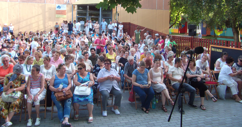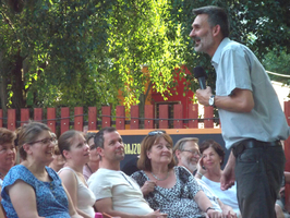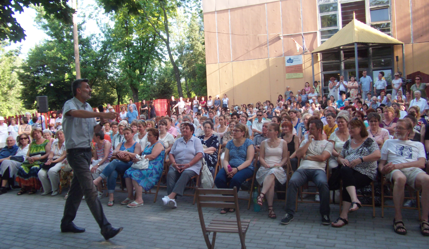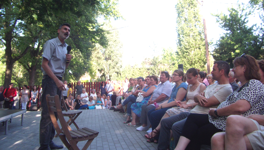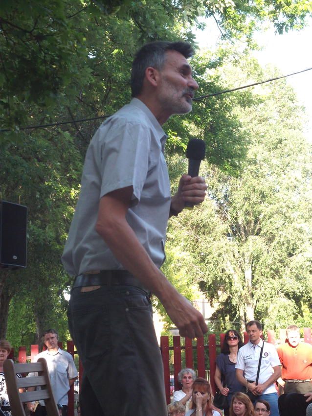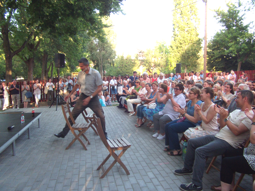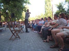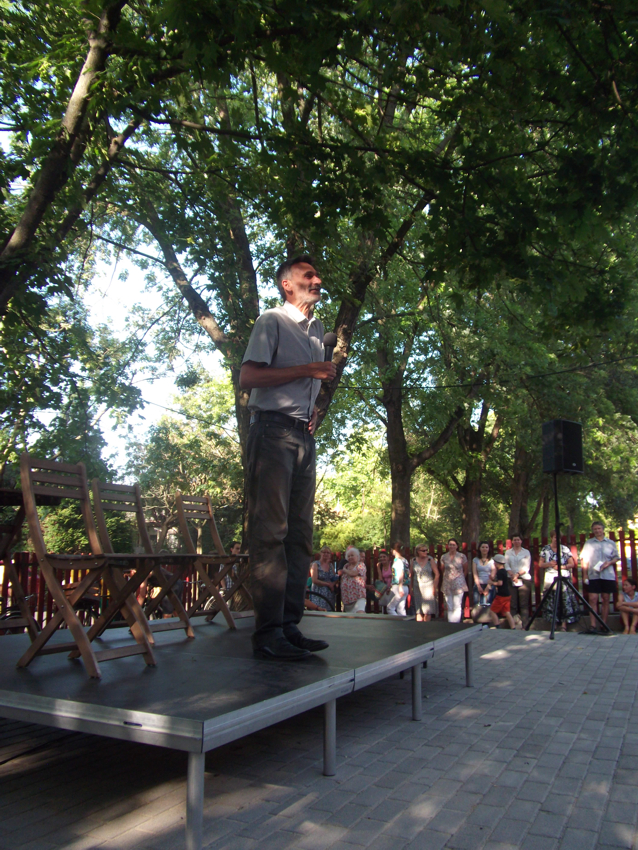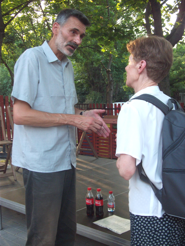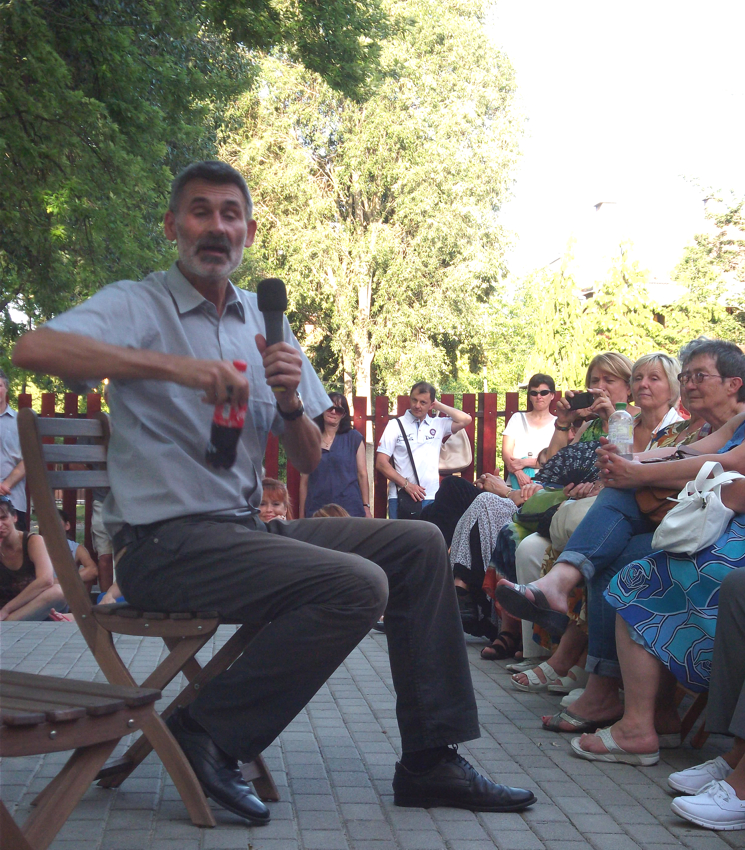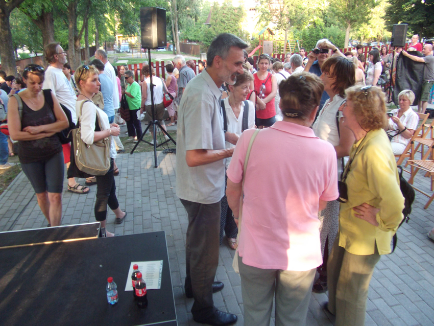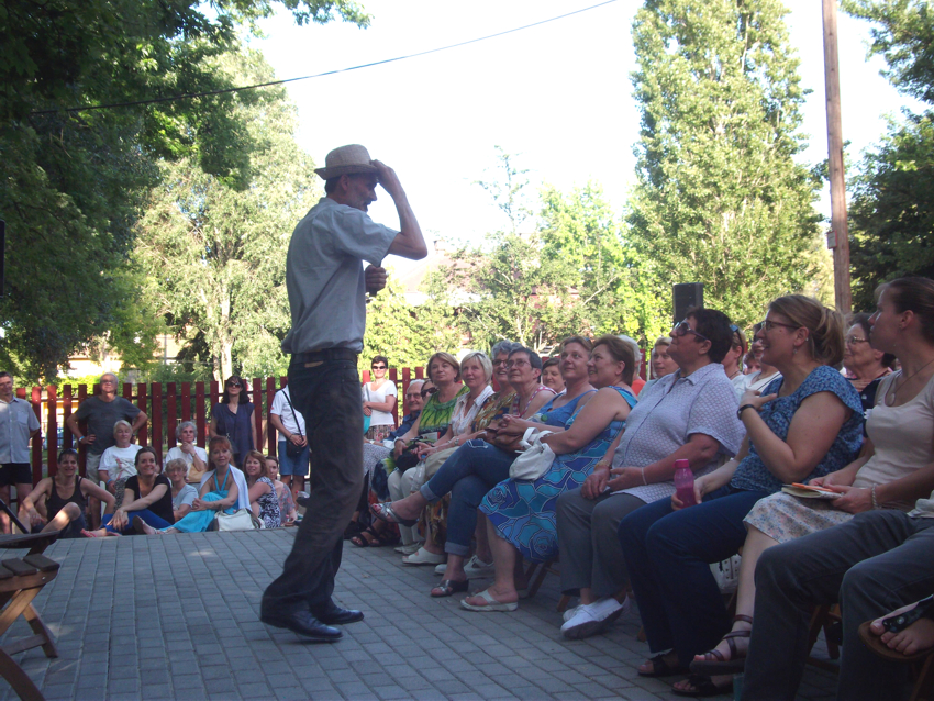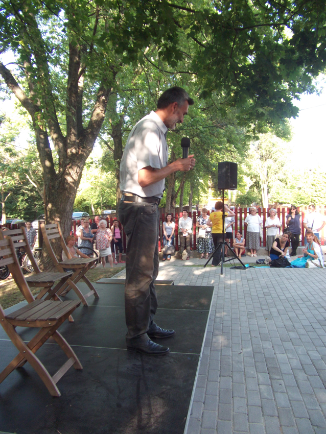 Pál Feri atya előadása közösségfejlődésről, közösségi létről a könyvtár kertjében