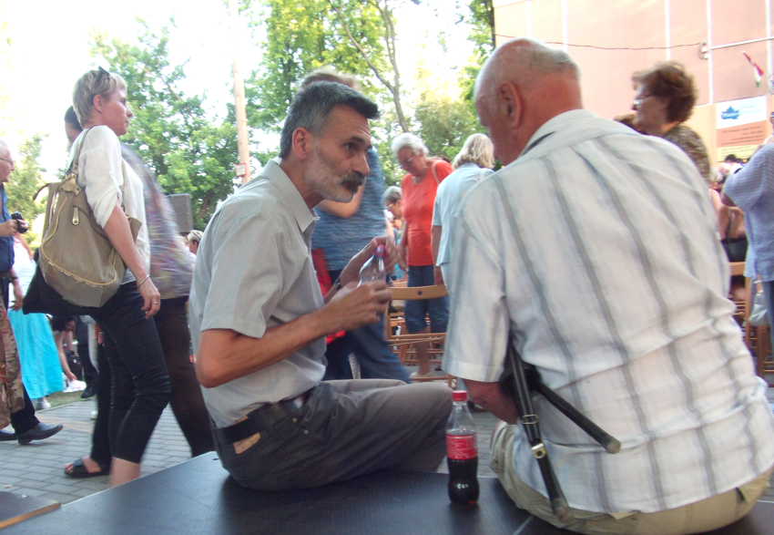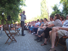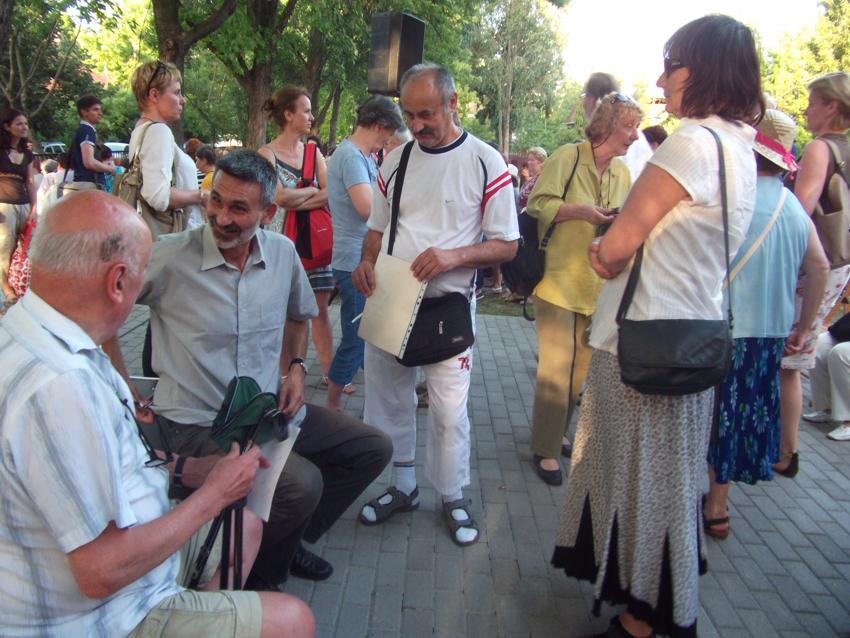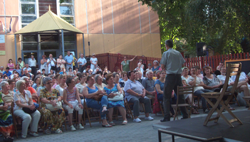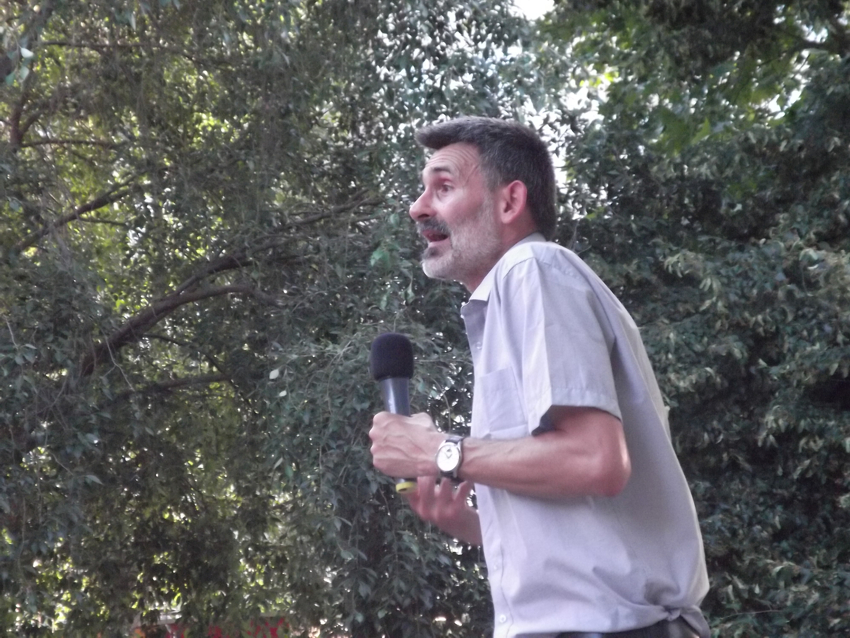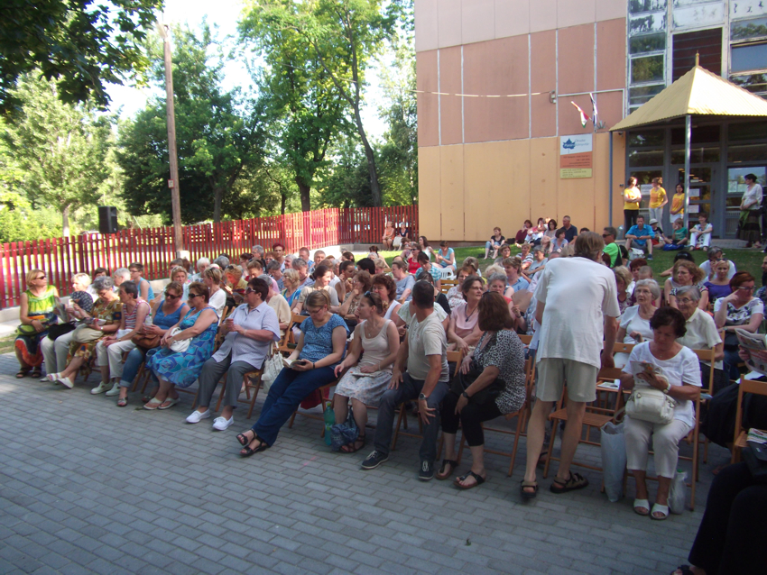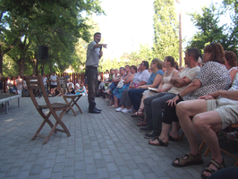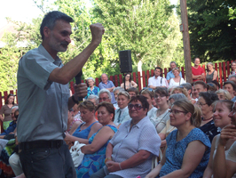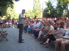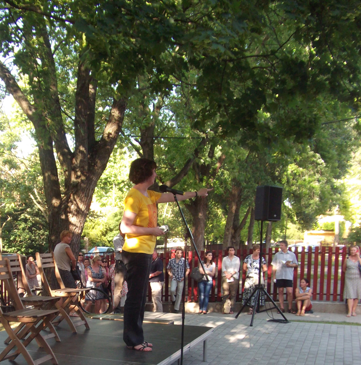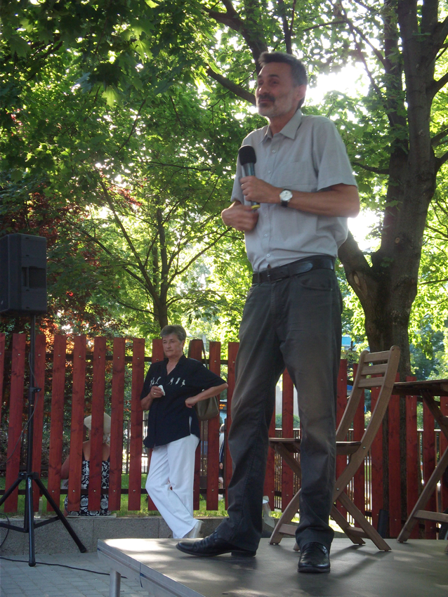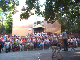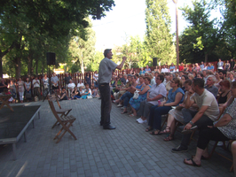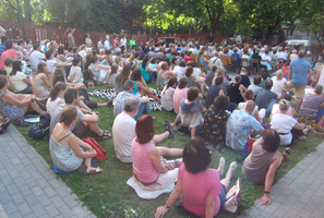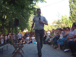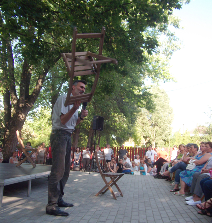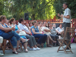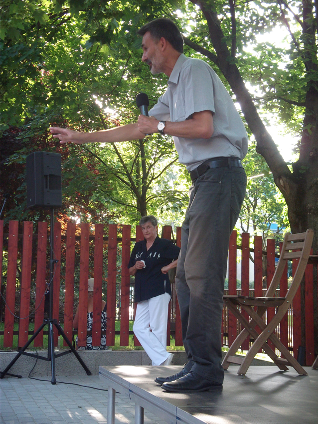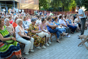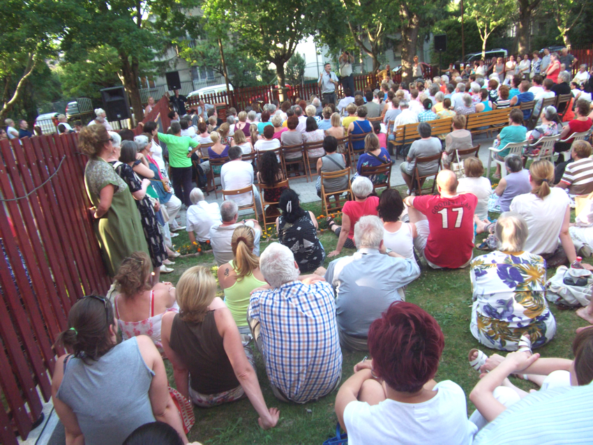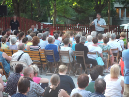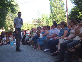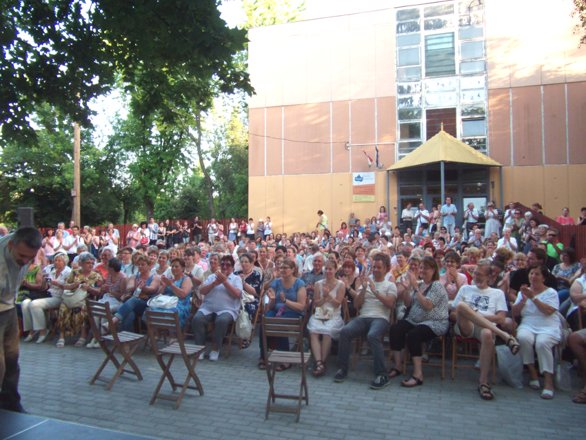 Pál Feri atya előadása közösségfejlődésről, közösségi létről a könyvtár kertjében