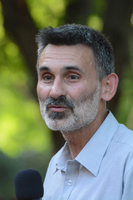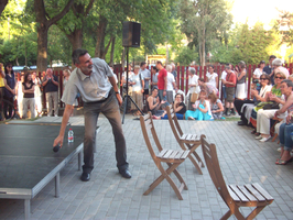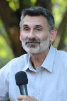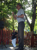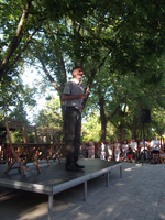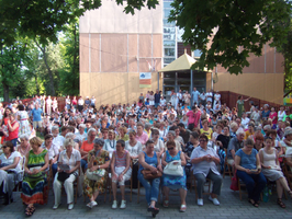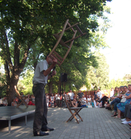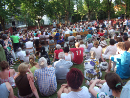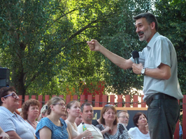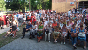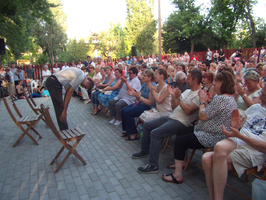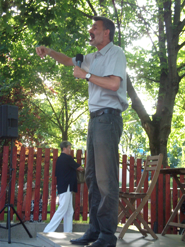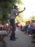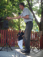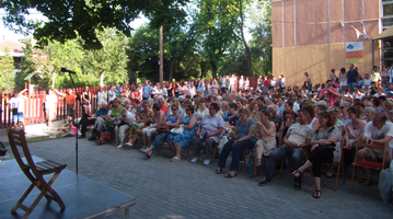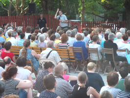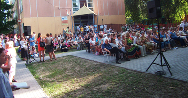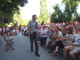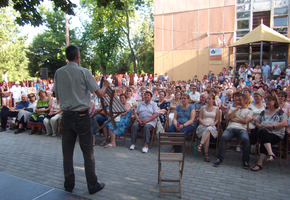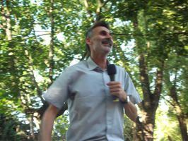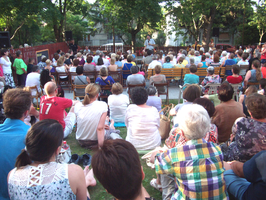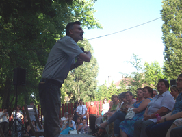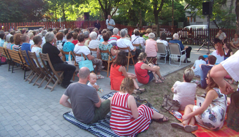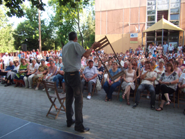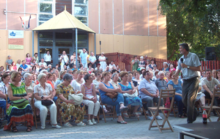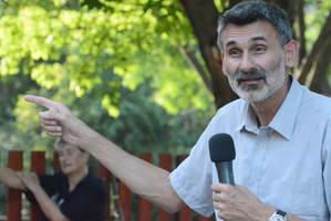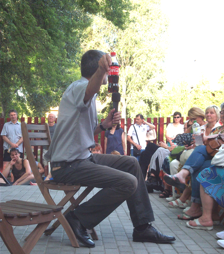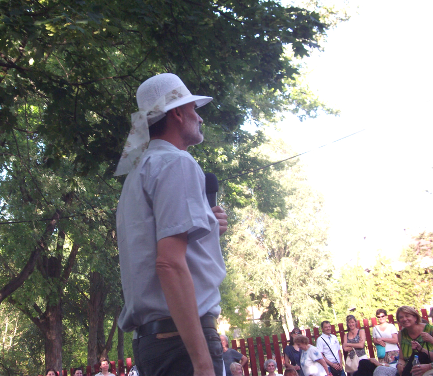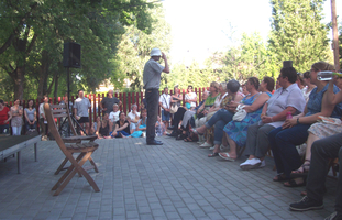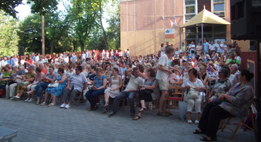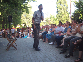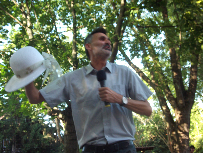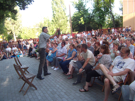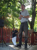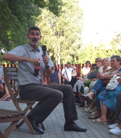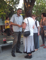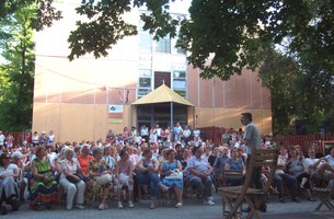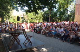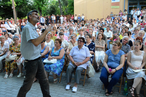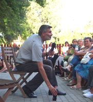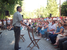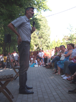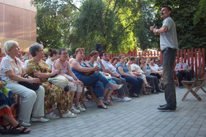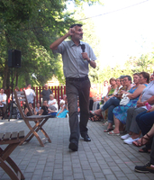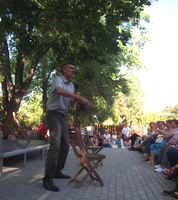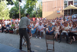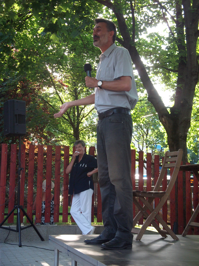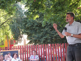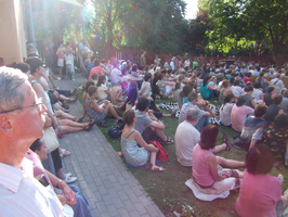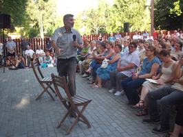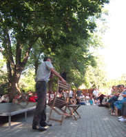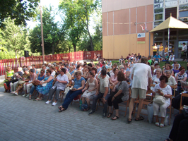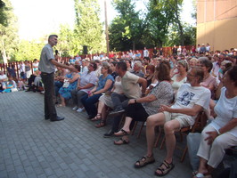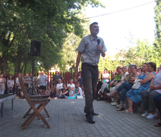 Pál Feri atya előadása közösségfejlődésről, közösségi létről a könyvtár kertjében