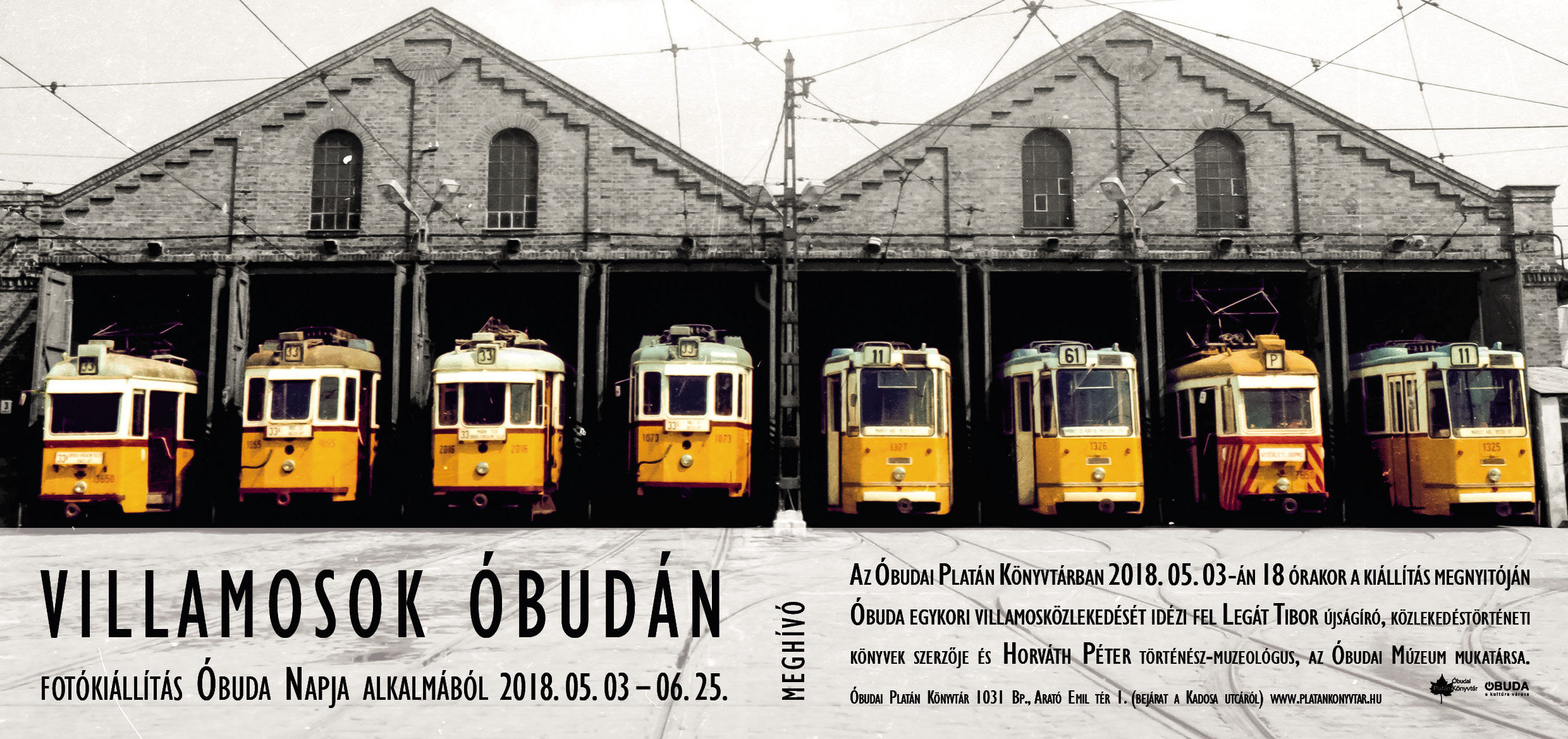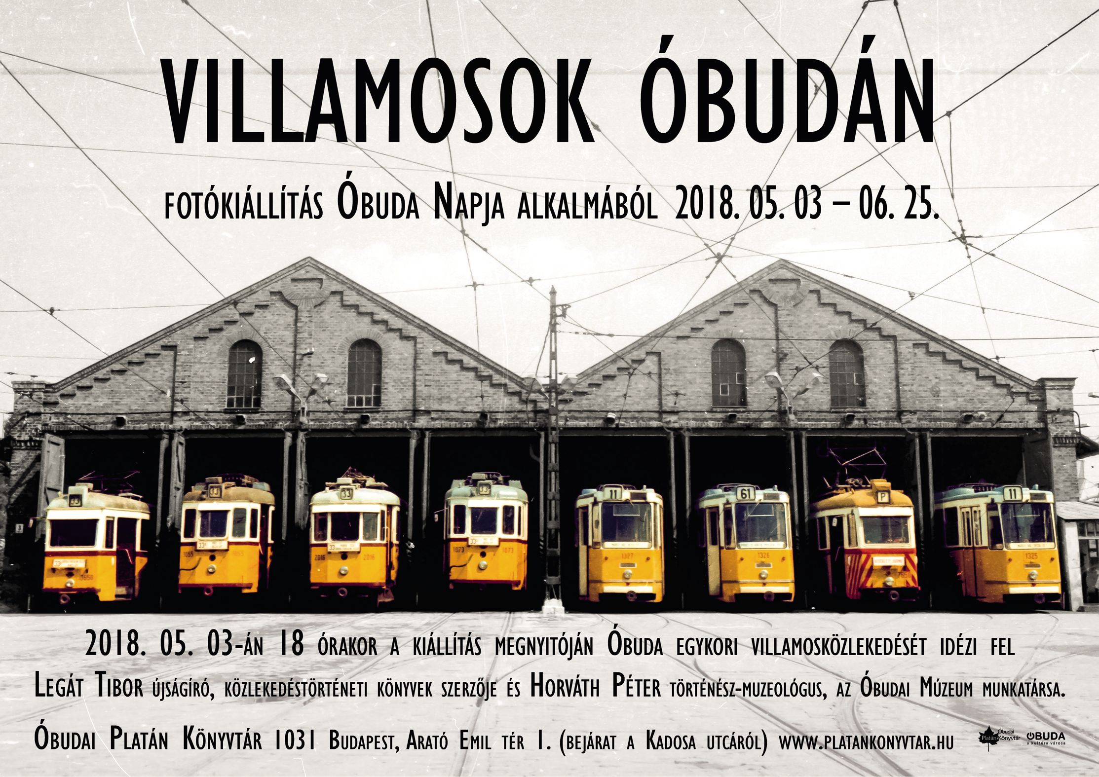 2018. május 3-án 18 órakor A villamosok virágzása és romlása Óbudán címmel kiállításmegnyitó előadást tart Legát Tibor újságíró, a Közlekedik a főváros és más nagy sikerű közlekedéstörténeti könyvek szerzője. Óbuda egykori villamosközlekedését a II. világháború végétől az ezredfordulóig idézik fel beszélgetőpartnerével, Horváth Péter történész-muzeológussal, az Óbudai Múzeum munkatársával.