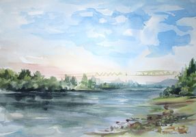 Az Óbudán élő művész-rajztanár festményei a Római-partról készült akvarellek, de a „Vizek békessége” c. sorozatból is láthatunk néhány képet a Tisza és a Balaton szépségéről.