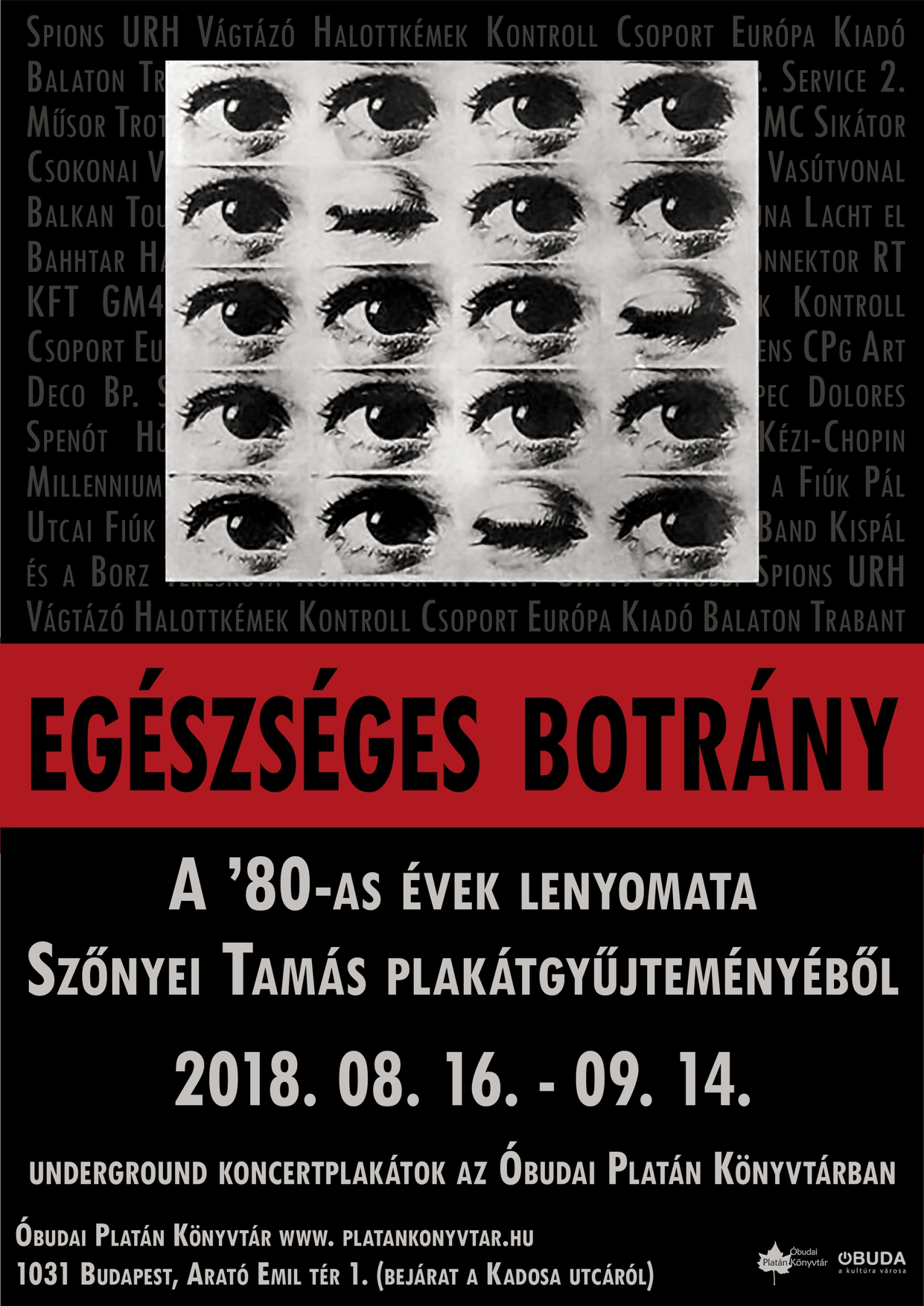 A befutott zenészek többsége értetlenül, a média konzervatív része idegenkedve, a hivatalos intézmények gyanakodva fogadták a 80-as évek budapesti klubjaiban feltűnt fiatal együtteseket. Csak botrányt akarnak – sütötték rájuk elítélő általánosítással. „A botrány, a botrány az egészséges” – foglalta dalba ugyanekkor a művészettörténet egyik tanulságát a Bizottság. Ők és az új hullám többi képviselői – Spions, URH, Vágtázó Halottkémek, Kontroll Csoport, Európa Kiadó, Balaton, Trabant, Neurotic, ETA, Kretens, CPg, Art Deco, Bp. Service, 2. Műsor, Trottel, Sziámi, Sexepil, Kampec Dolores, Spenót, Hús, CMC, Sikátor, Csokonai Vitéz Műhely, Kézi-Chopin, Millenniumi Földalatti Vasútvonal, Balkan Tourist, Ági és a Fiúk, Pál Utcai Fiúk, Orkesztra Luna, Lacht el Bahhtar, Happy Dead Band, Kispál és a Borz, Tereskova, Konnektor RT, KFT, GM49, Satöbbi stb. – nemcsak zeneileg kavarták fel az állóvizet, hanem koncertplakátjaikkal is színt vittek a hétvégi utcaképbe. E plakátokból halmozott fel impozáns gyűjteményt Szőnyei Tamás, aki a hasonló kollekcióval rendelkező Bp. Szabó Györggyel összefogva 2017-ben, Pokoli aranykor című kötetükben és a Kieselbach Galéria kiállításán hívta elő a bő három évtizeddel korábbi hangulatot. Ezúttal Egészséges botrány címmel Szőnyei gyűjteményéből láthatók érdekes darabok az Óbudai Platán Könyvtárban.