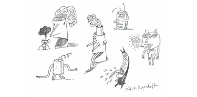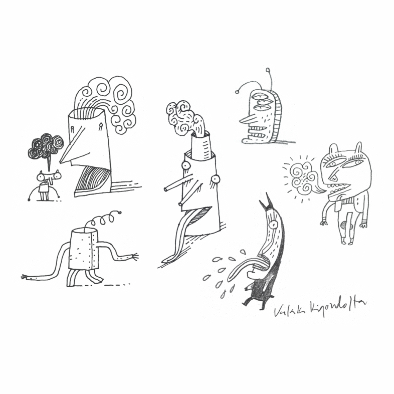 Illusztrációk helyett, csakis firkákból álló izgalmas kiállítás, egyenesen Dániel András író - illusztrátor fiókjának titkos zugában meglapuló rajzokból kiválogatva. Borítékok hátuljára, fecnikre, kéziratok margójára felskiccelt grafikák láthatóak szokatlanul nagy méretben.