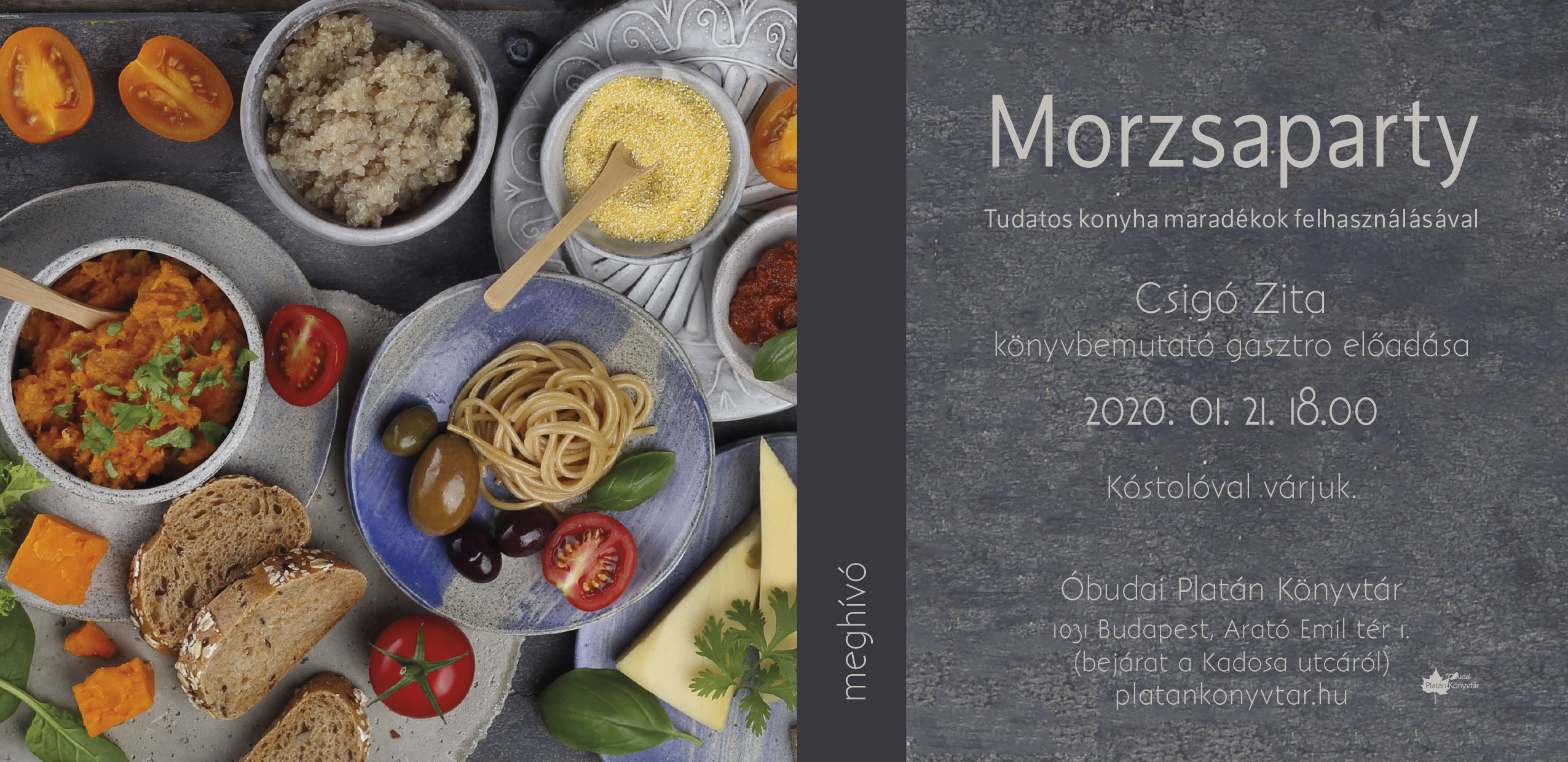 Biztosan sokunkkal előfordult már, hogy megmaradt némi nyers vagy főtt étel, ha rendszeresen főzünk, ez bizony elkerülhetetlen. Kidobni viszont teljesen felesleges a még fogyasztható élelmiszereket, inkább vegyük elő a kreativitásunkat, és alkossunk finom, egészséges ételeket! Erre biztat Csigó Zita is új szakácskönyvében, a Morzsapartyban. A kóstolóval egybekötött előadás tudatos szemlélettel ösztönöz a pazarlás elkerülésére és ismertet meg bennünket jobbnál jobb ötletekkel a maradékok hasznosítására.