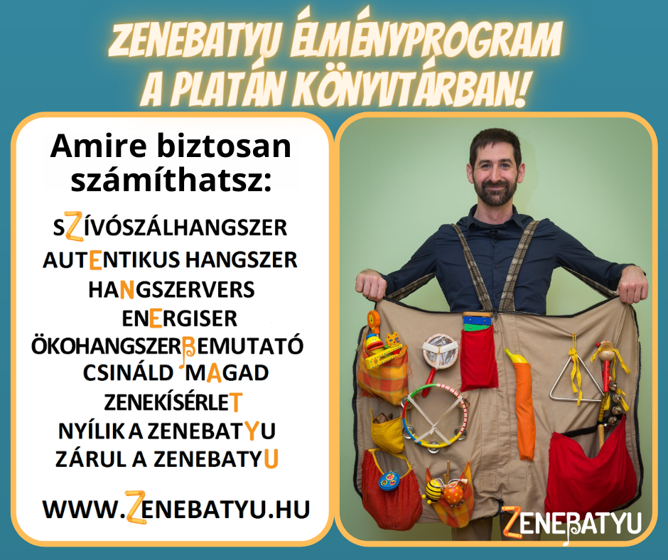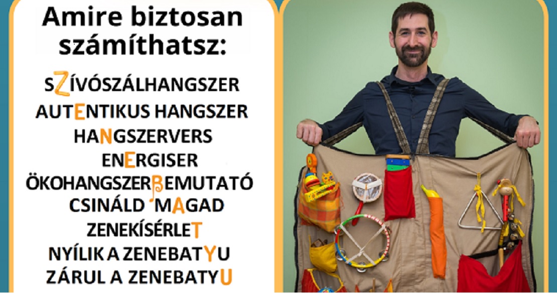 Sőnfeld Mátyás zeneterapeuta programja fergeteges zenés élményt ígér, különleges hangszerekkel találkozhattok, kiderül, hogy lesz szívószálból duda, milyen hangszer lesz a chipses dobozból, kísérletezhettek rezgésekkel, tippet kaptok arra, hogyan készítsetek otthon hangszert. Mozgás, játék, ének a szabadtéren! Mindez gitár kísérettel és természetesen rengeteg hangszerrel!