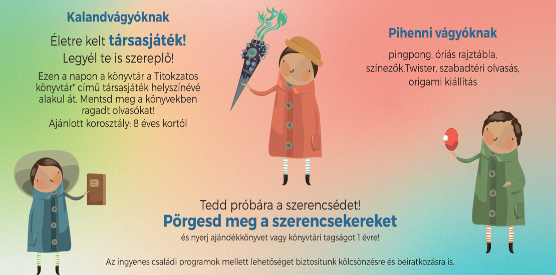 Ezen a napon a könyvtár társasjáték helyszínné alakul át a The Mysterius Library by Marbushka társasjáték alapján. Minden kalandvágyó látogató szereplője lehet az élő társasjátéknak és megmentheti a könyvekben ragadt olvasókat, segítséget kérve a különleges tudással rendelkező könyvtárosoktól! Legyetek ti is szereplői a játéknak! A társasjátékot 8 éves kortól ajánljuk!