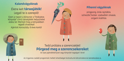 Akár játszani, akár pihenni térnek be a könyvtárba, minden látogató próbára teheti szerencséjét! A szerencsekerék megpörgetésével ajándékkönyvet vagy egy évre szóló könyvtári tagságot lehet nyerni.