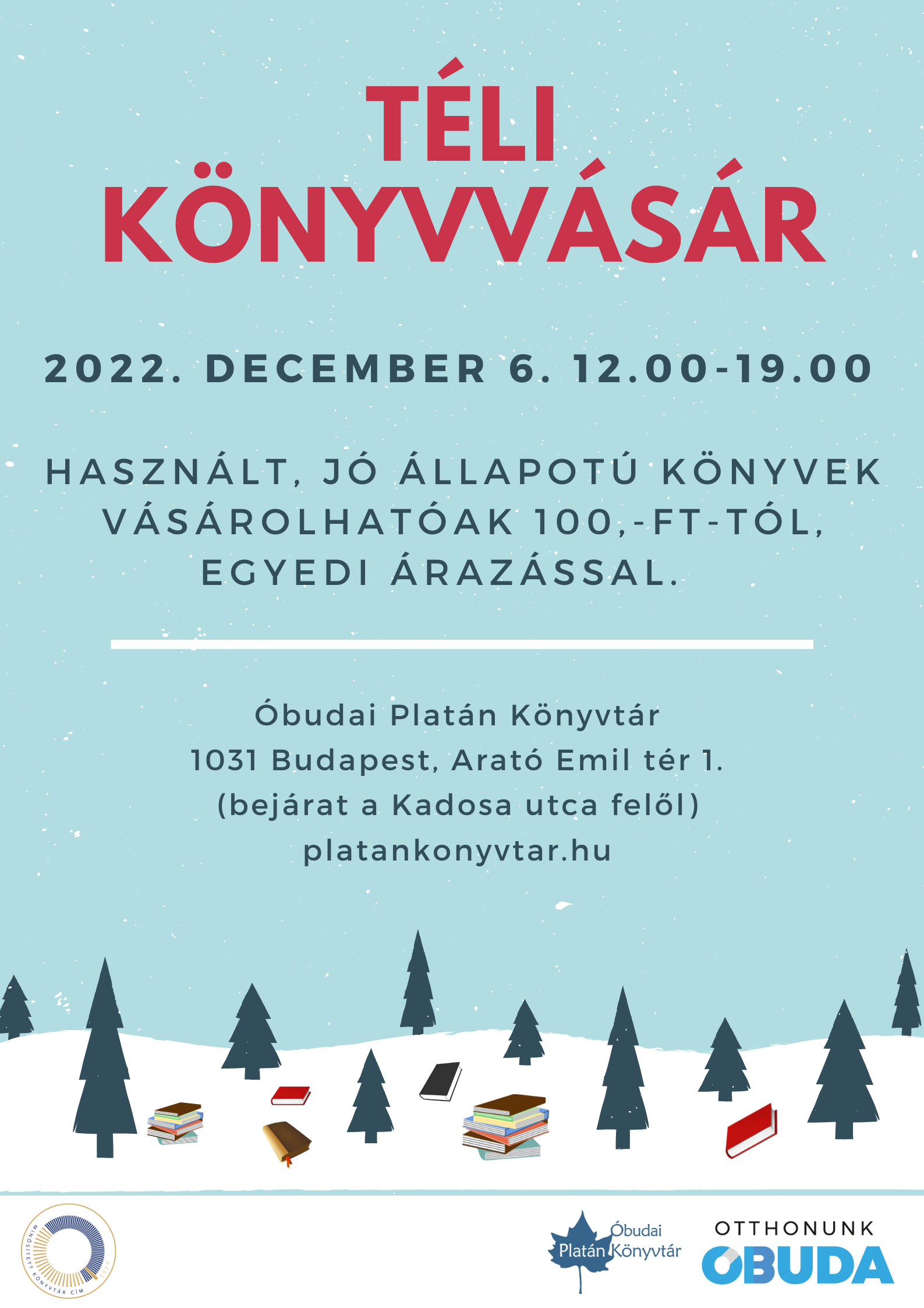 ÓBUDAI PLATÁN KÖNYVTÁR NYITVATARTÁSA hétfő: zárva, kedd: 12-19, szerda: 9-15, csütörtök: 9-15, péntek: 12-19, szombat kéthetente: 9-13 [2025. évben nyitvatartó szombatok: január 18., február 1., 15., március 1., 29., április 12., 26., május 10., 22., június 7., 21., július 5., augusztus 16., 30., szeptember 13., 27., október 11., november 8., 22., december 6., 20.]