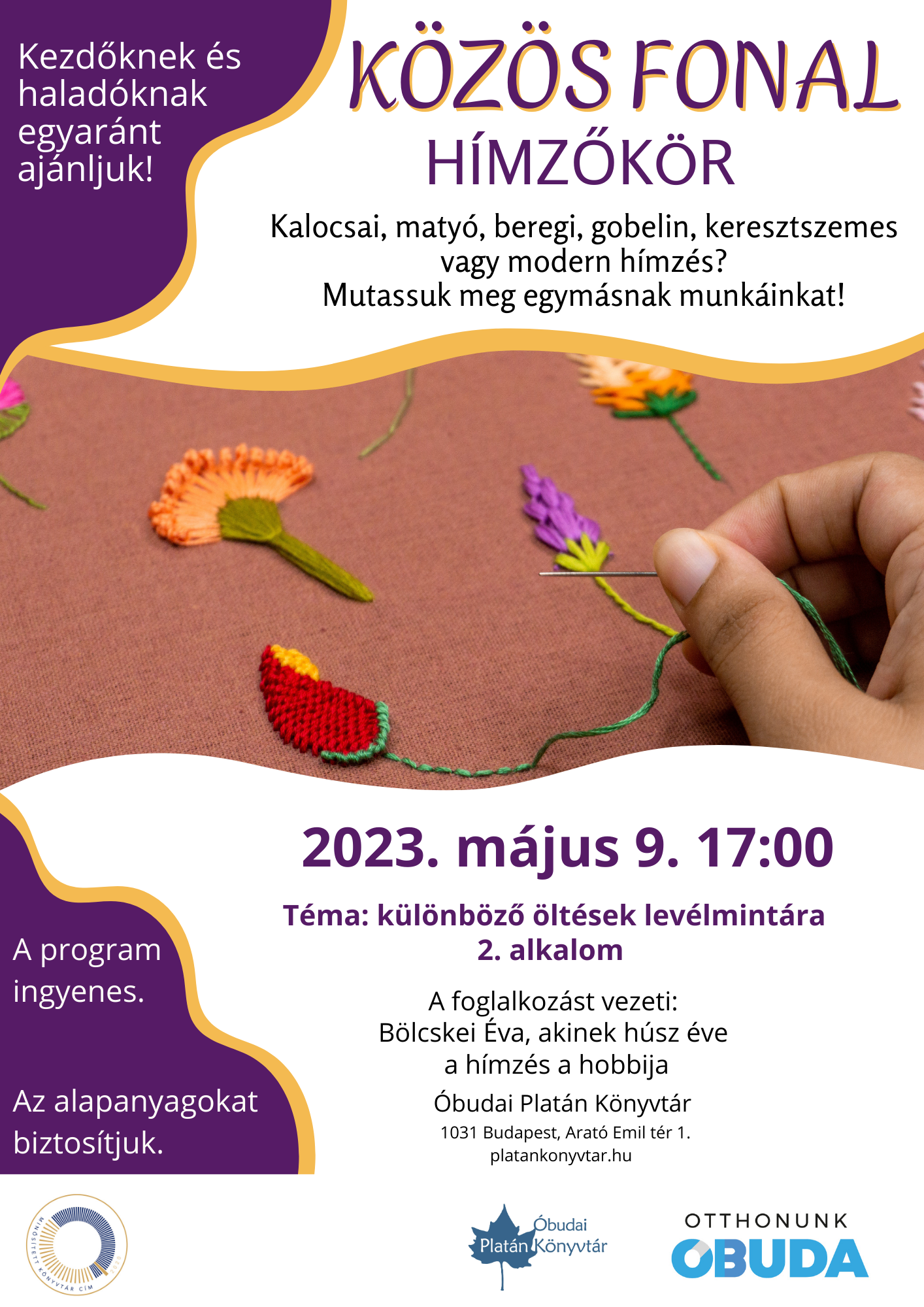 Neked is a szekrény mélyén laknak a félig kész hímzések? Kalocsai, matyó, beregi? Gobelin, keresztszemes, modern hímzés? Gyere el és mutassuk meg egymásnak a munkáinkat! Hímezzünk együtt, miközben megosztjuk tudásunkat egy jó hangulatú társaságban. A májusi téma:különböző öltések levélmintára 2. alkalom. Az alapanyagokat biztosítjuk, a program ingyenes.