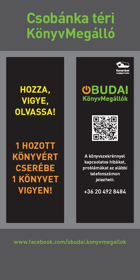 A kerületben már több helyen működő KönyvMegállók után júniustól már a Békásmegyeri Közösségi Háznál a Csobánka téren is várja a könyveket, az olvasást szerető érdeklődőket a szabadtéri könyvszekrény. Az Önkormányzat támogatásával felállított, ingyenesen használható, mindig nyitva álló szekrényből bárki kiveheti a neki tetsző olvasmányt, ha cserébe hoz helyette másikat. A szekrény első feltöltését és a működtetését az Óbudai Platán Könyvtár biztosítja.