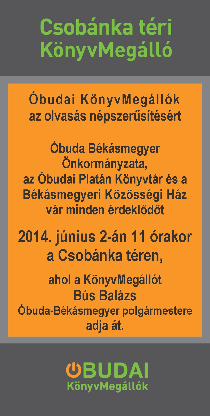 Óbuda Békásmegyer Önkormányzata, az Óbudai Platán Könyvtár és a Békásmegyeri Közösségi Ház vár minden érdeklődőt 2014. június 2-án 11 órakor a Csobánka téren, ahol a KönyvMegállót Bús Balázs Óbuda-Békásmegyer polgármestere adja át.