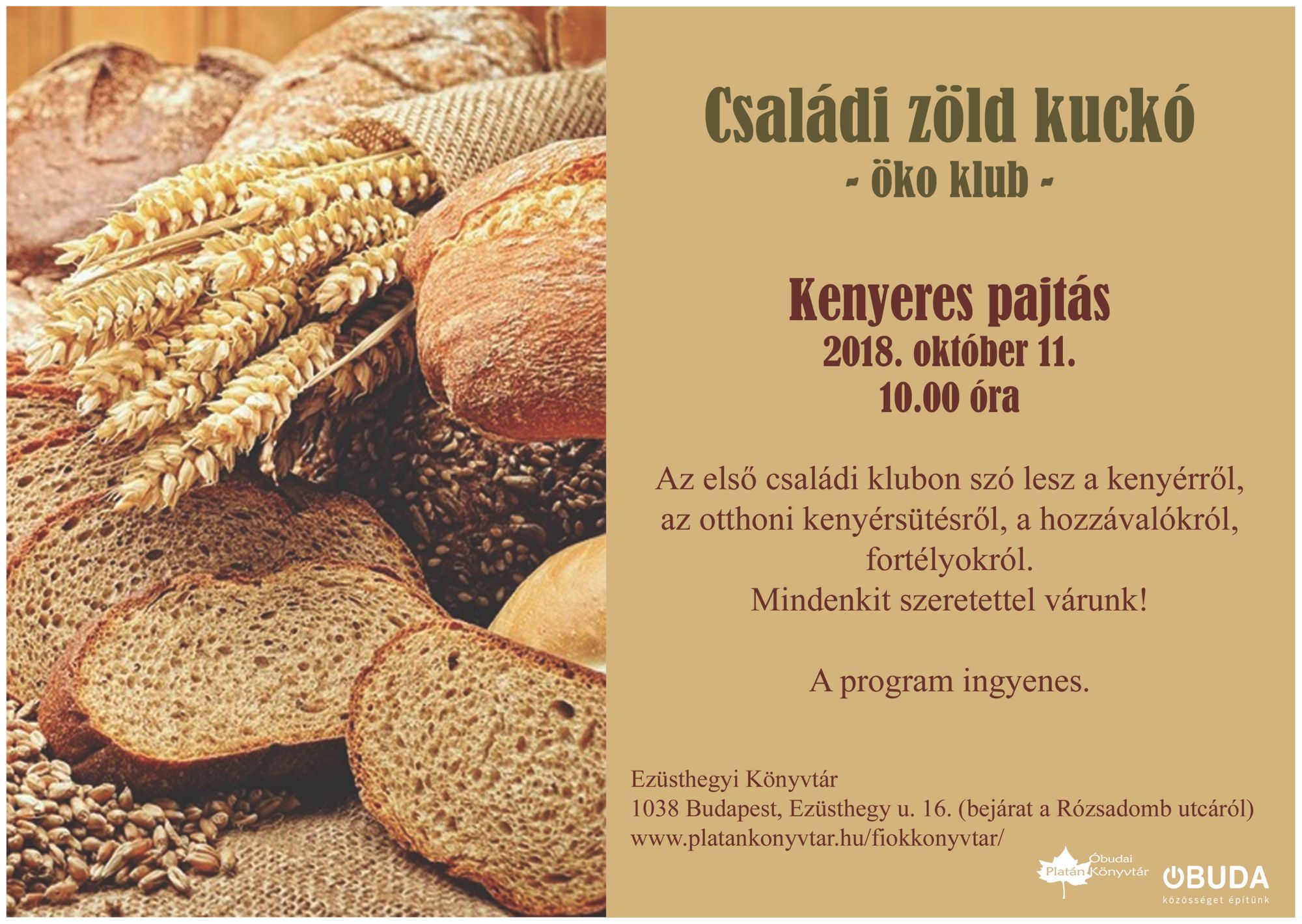 A kenyér nem csupán liszt és víz keveréke, nemcsak sütőipari termék, sokkal több annál. A kenyér az élet jelképe. Nagyanyáink azt mondták: ha kenyér van, minden van, ha kenyér nincs, semmi sincs. Az első családi klubon szó lesz a kenyérről, az otthoni kenyérsütésről, a hozzávalókról, fortélyokról. Mindenkit szeretettel várunk kenyeres pajtásnak!