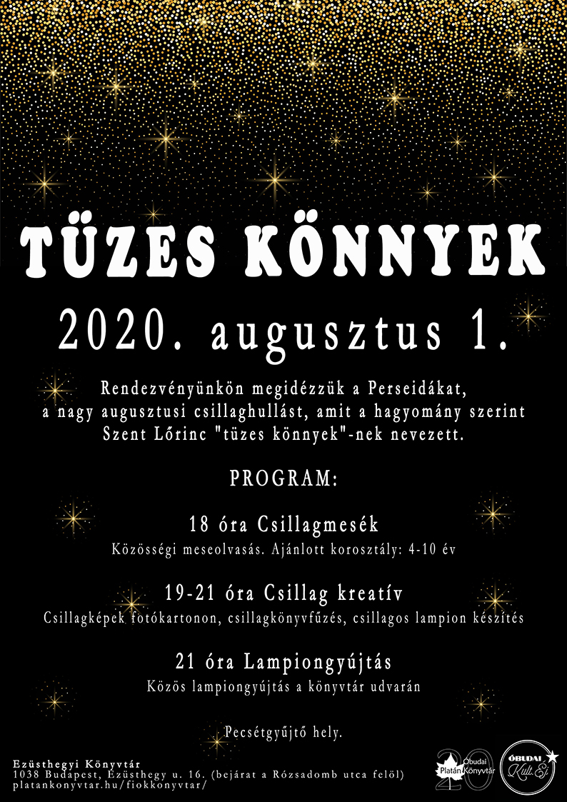 Rendezvényünkön megidézzük a Perseidákat, a nagy augusztusi csillaghullást, amit a hagyomány szerint Szent Lőrinc "tüzes könnyek"-nek nevezett. Közösségi meseolvasással, kézműves foglalkozásokkal és lampionfényekkel várjuk az érdeklődőket!
