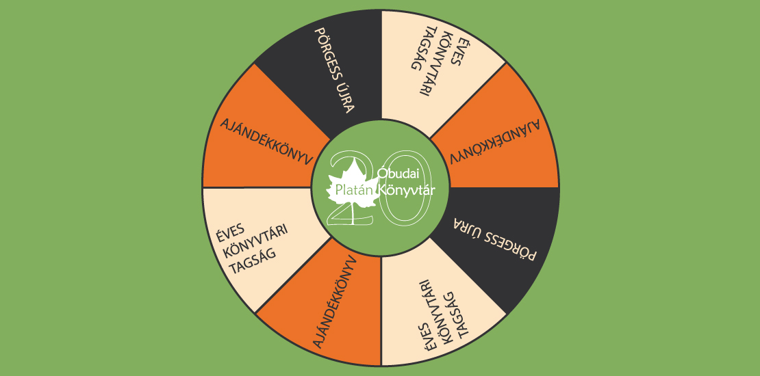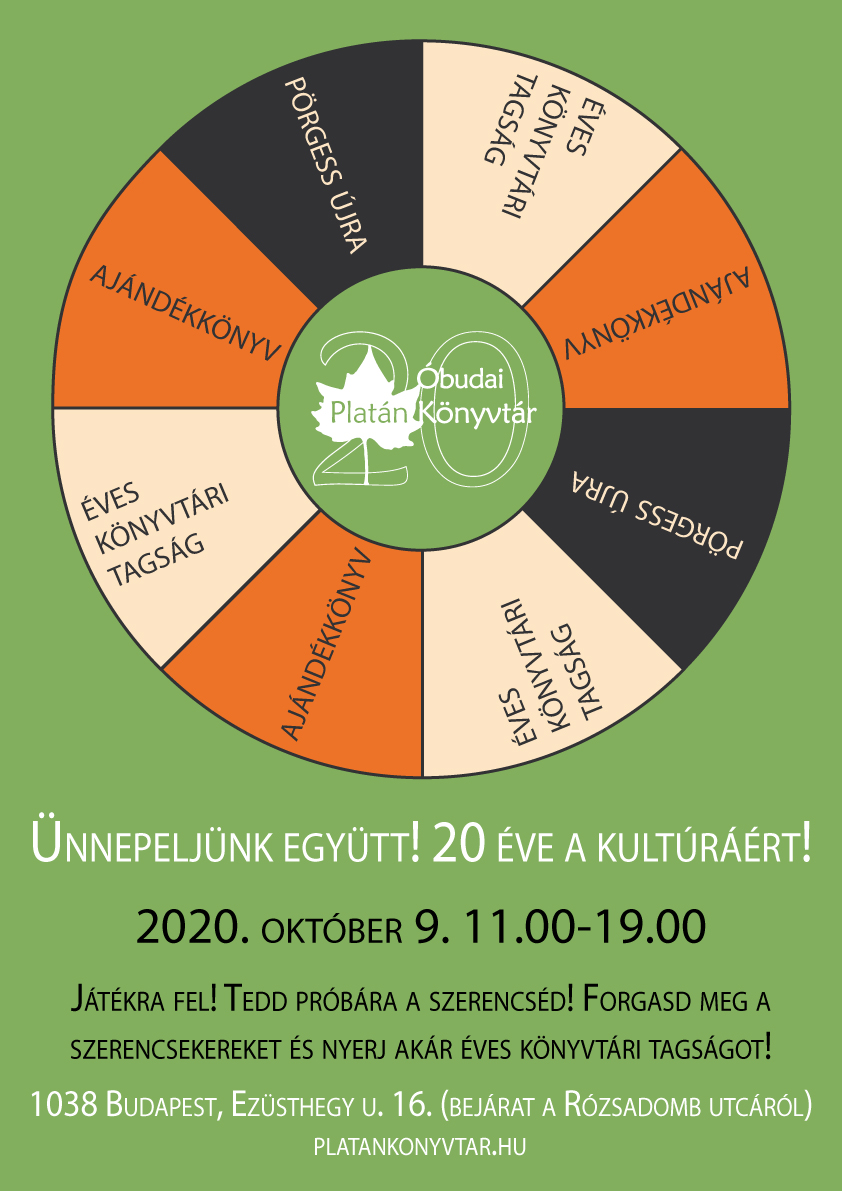 Játékra fel! Szeretnétek könyvtári tagságot, vagy ajándékkönyvet nyerni? Akkor pörgessétek meg a könyvtárainkban a 20 éves évforduló alkalmából kihelyezett szerencsekerekeket október 9-én és ne feledjétek, akik 2020-ban töltik be 20. születésnapjukat, ingyen iratkozhatnak be, vagy hosszabbíthatják meg könyvtári tagságukat egész évben.