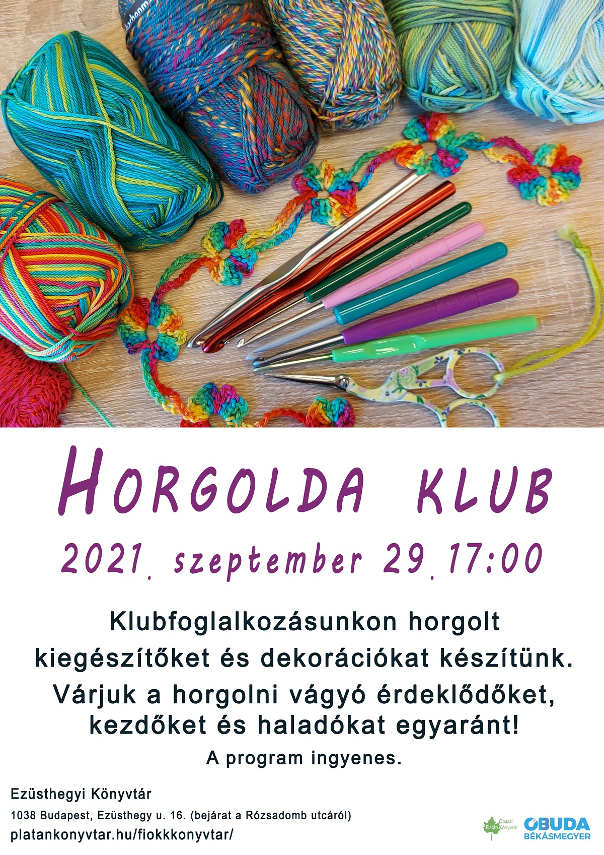 Klubfoglalkozásunkon horgolt kiegészítőket és dekorációkat készítünk. Várjuk a horgolni vágyó érdeklődőket, kezdőket és haladókat egyaránt!