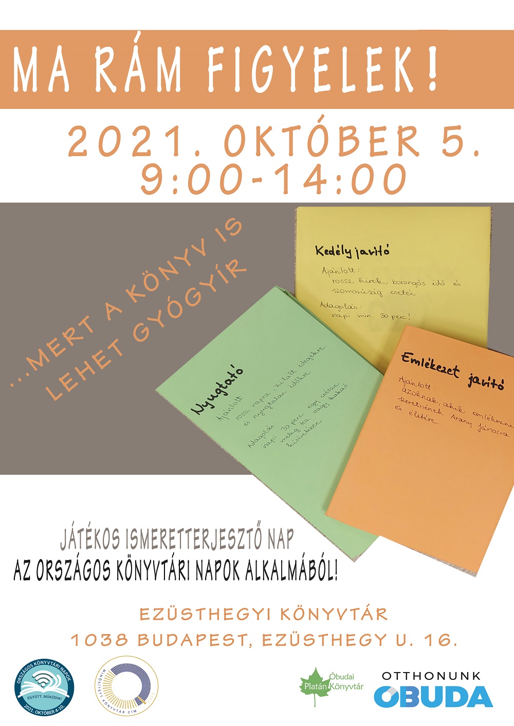 Játékos ismeretterjesztő napaz Országos Könyvtári Napok alkalmából a mentális egészség fontosságáról könyvmolyoknak és másoknak, mert a könyv is lehet gyógyír!