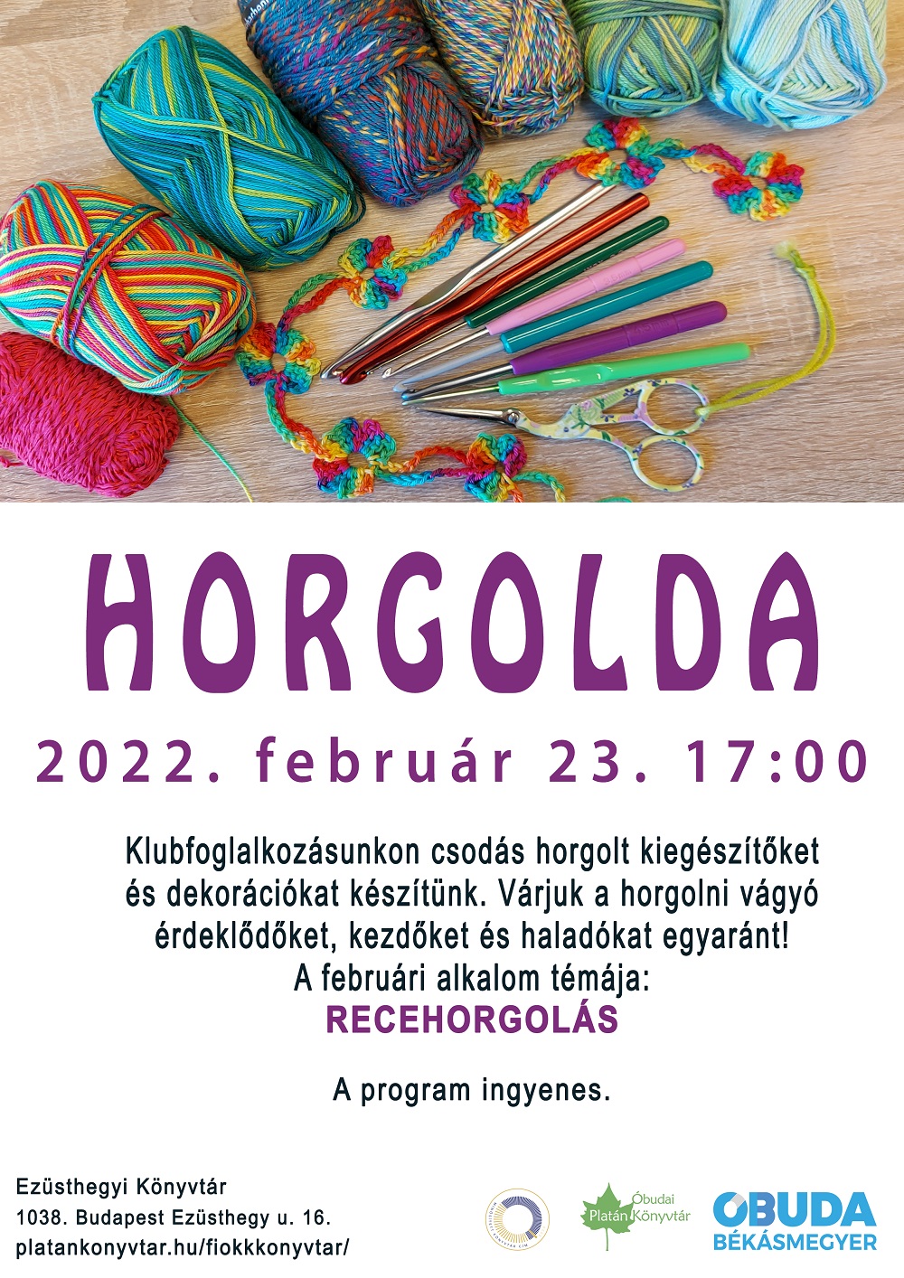 Klubfoglalkozásunkon horgolt kiegészítőket és dekorációkat készítünk. Várjuk a horgolni vágyó érdeklődőket, kezdőket és haladókat egyaránt!