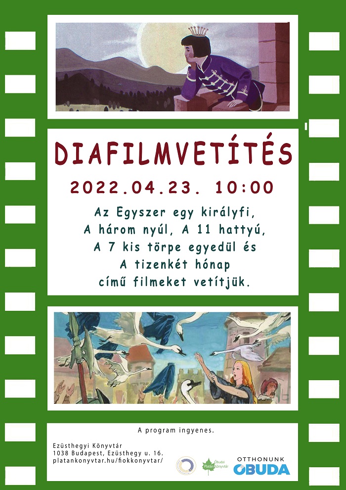 Mesedélelőtt a könyvtárban. Az Egyszer egy királyfi, A három nyúl, A 7 kis törpe egyedül, A 11 hattyú és A tizenkét hónap című diafilmeket vetítjük.