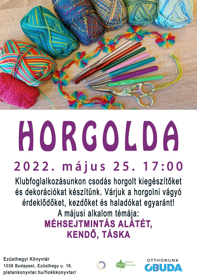 Klubfoglalkozásunkon horgolt kiegészítőket és dekorációkat készítünk. Várjuk a horgolni vágyó érdeklődőket, kezdőket és haladókat egyaránt!