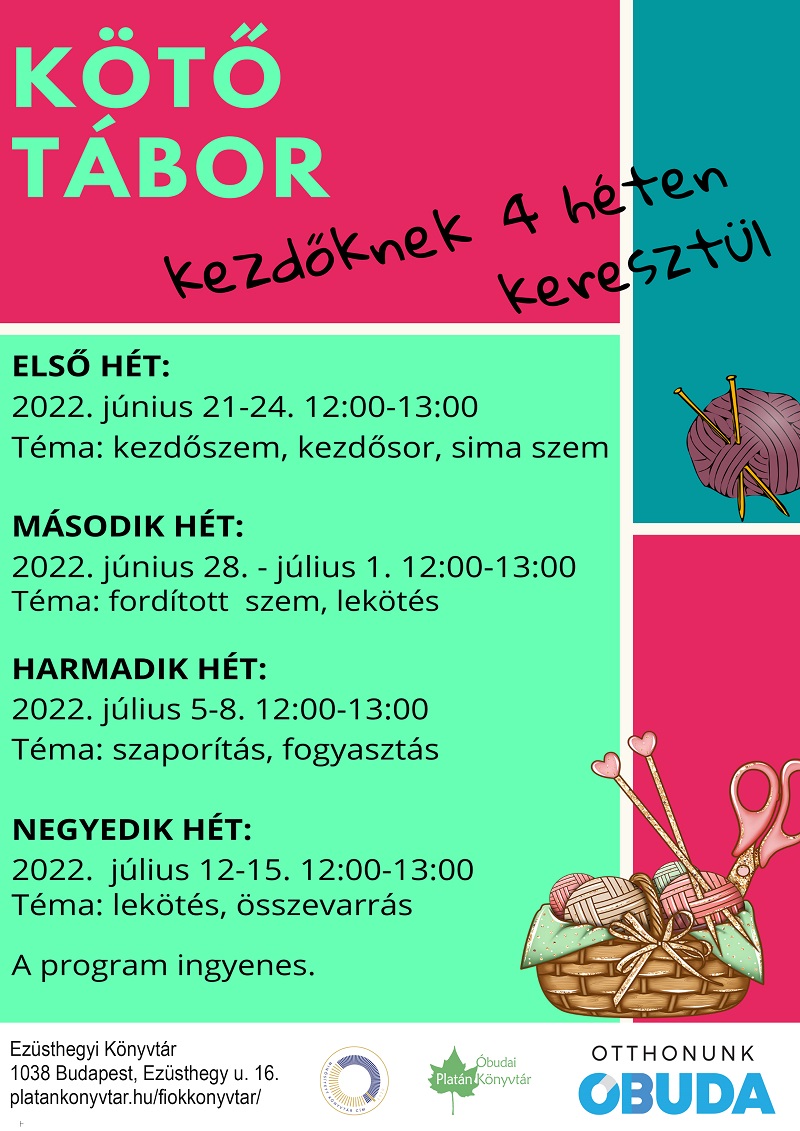 Ha szeretnél megtanulni kötni, vagy szeretnéd felidézni a régen tanultakat, de év közben nem volt rá alkalmad, akkor várunk téged nyári kötőtáborunkban! Minden héten új alaptechnikát ismerhetsz meg, melynek segítségével önállóan is készíthetsz egyedi darabokat.