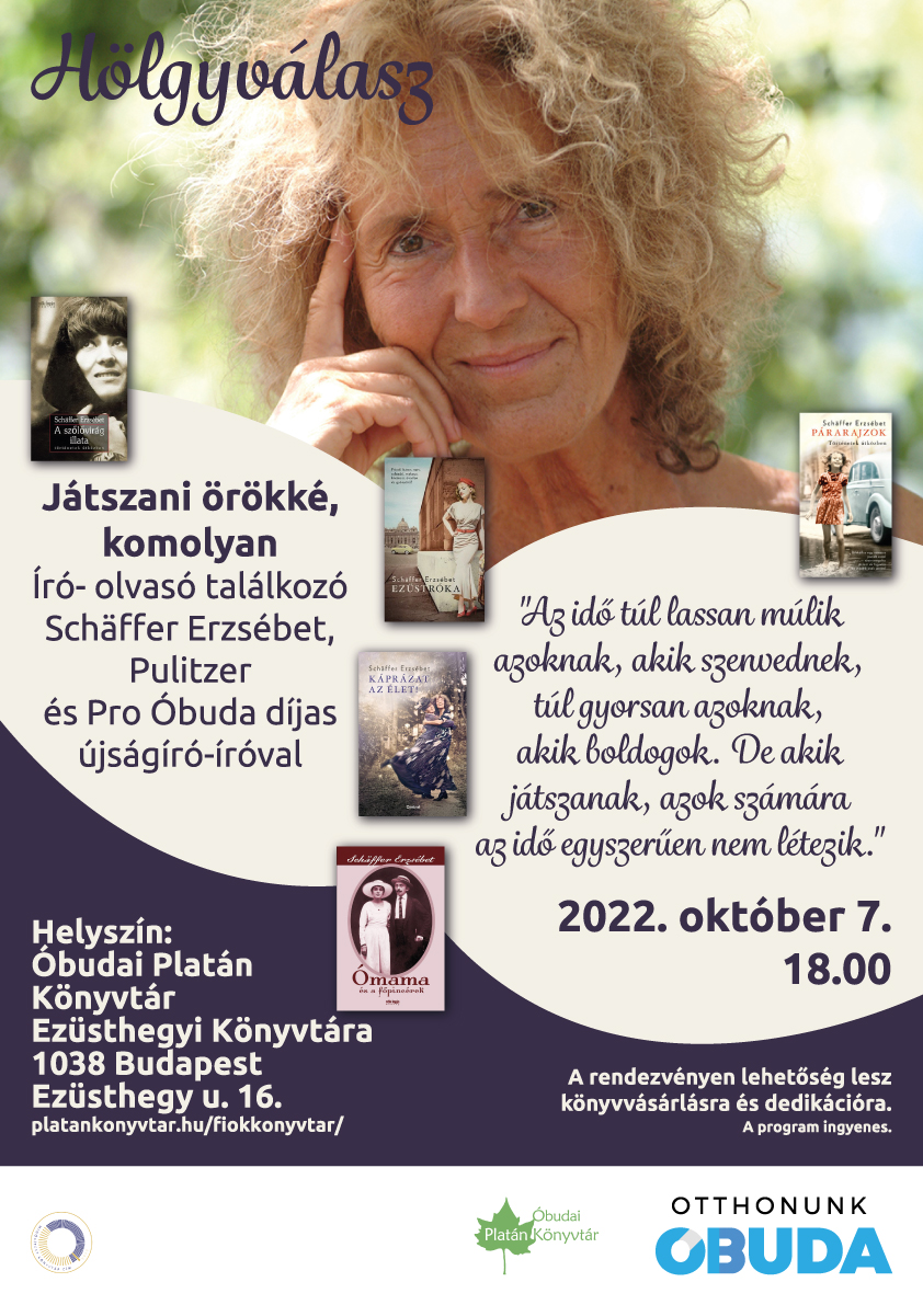 Hölgyválasz rendezvénysorozatunk vendége a Pulitzer és Pro Óbuda díjas újságíró és író Schäffer Erzsébet. Az író-olvasó találkozó témája ezúttal: Játszani örökké, komolyan.