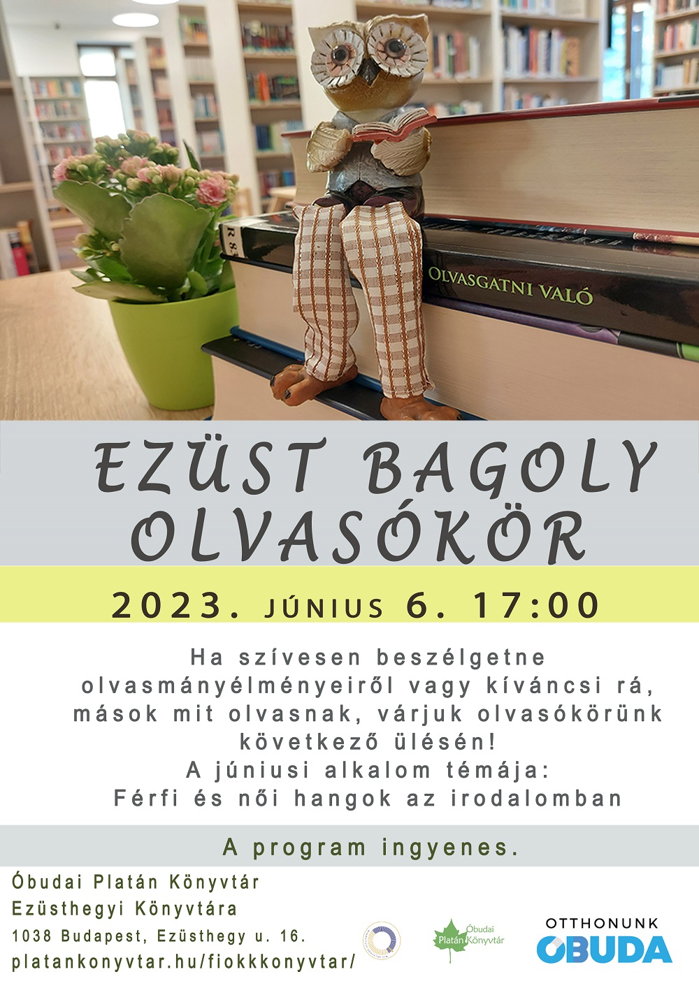 Ha szívesen beszélgetne olvasmányélményeiről vagy kíváncsi rá, mások mit olvasnak, várjuk olvasókörünk következő ülésén. A júniusi beszélgetés témája: női és férfihangok az irodalomban.