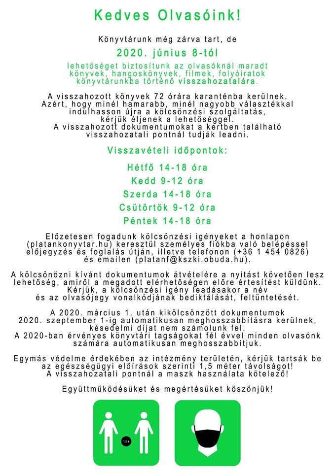 Az Ezüsthegyi Könyvtár még zárva tart, de 2020. június 8-tól lehetőséget biztosítunk az olvasóknál maradt könyvek, hangoskönyvek, filmek, folyóiratok könyvtárunkba történő visszahozatalára. A visszahozott könyvek 72 órára karanténba kerülnek, csak ezt követően vesszük vissza az olvasójegyről és válnak újra kölcsönözhetővé az online katalógusrendszerben. Azért, hogy minél nagyobb választékkal indulhasson újra a kölcsönzési szolgáltatás, kérjük, éljenek a lehetőséggel. A visszahozott dokumentumokat a kertben található visszahozatali pontnál kérjük letenni.
