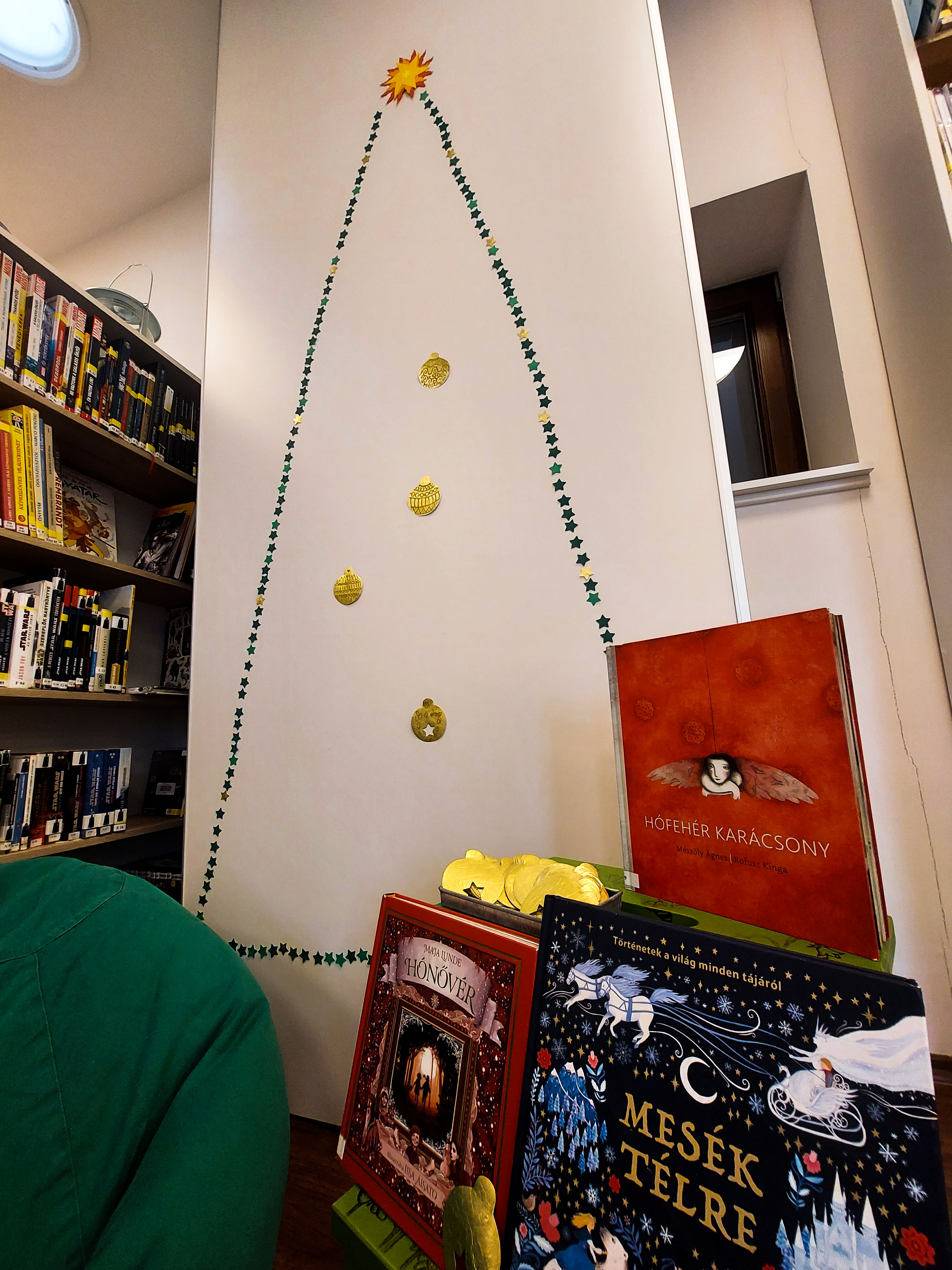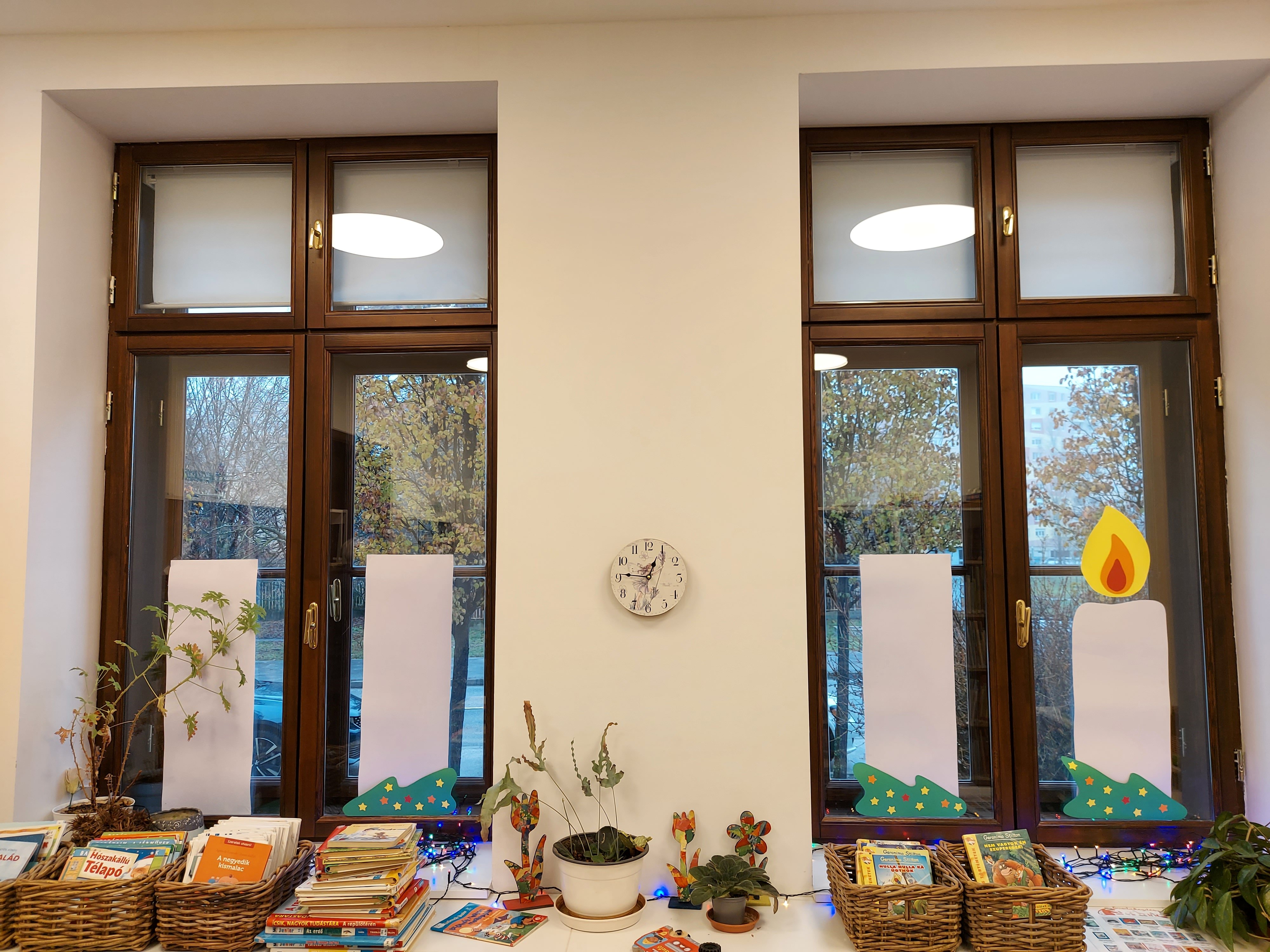 Zöld könyvtárunkban a karácsonyfánk újrahasznosított díszekben, könyvtárosaink pedig karácsonyi fülbevalókban tündökölnek. Az adventi gyertyáinknak ebben az évben is a gyerekkönyvtár ablaka ad helyet, ahol minden héten egy újabb gyertya kap lángot az ünnepekig.