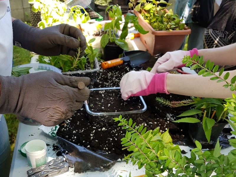 Első alkalommal a komposztálásról és az egyszerű növényszaporításról hallhattak részletes előadást a látogatók. Megismertük az otthonról hozott konyhai hulladékok kezelését, milyen anyagok komposztálhatóak és hogyan érdemes komposztot készíteni. Az ismeretek szemléltetésére a könyvtár kertjében kihelyezett komposztáló láda volt a segítségünkre. A növény szaporítási módok közül, a dugványozással, mint legegyszerűbb vegetatív szaporítási módszerrel lehetett megismerkedni. A folyamatot a hozott és a könyvtárban található növényeket tovább szaporítva szemléltettük, a gyökereztetés befőttesüvegekben és tejfölöspoharakban történt és a begyökeresedett új növényeket a látogatók később hazavihették, vagy a könyvtár kertjében kerültek kiültetésre.