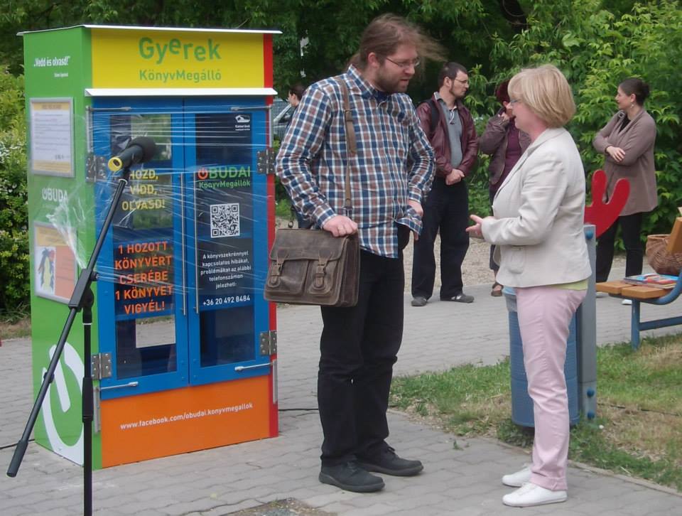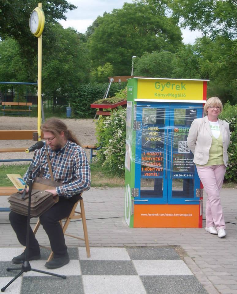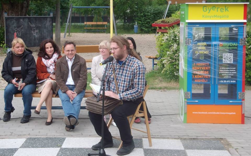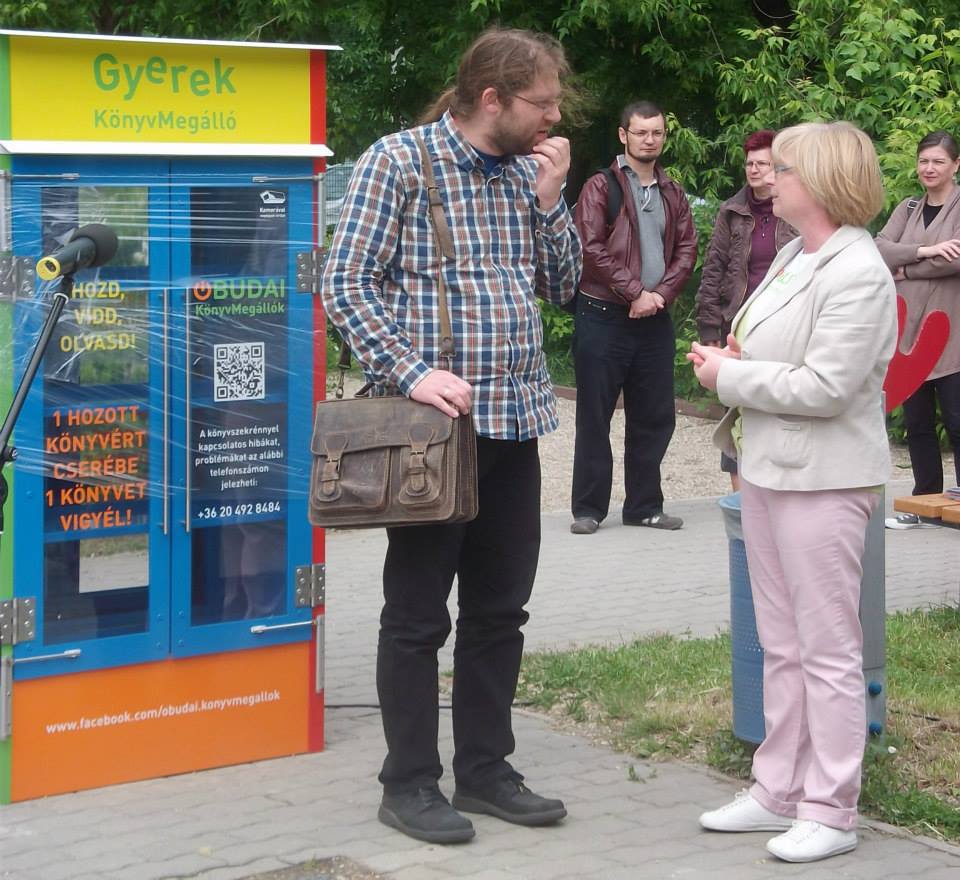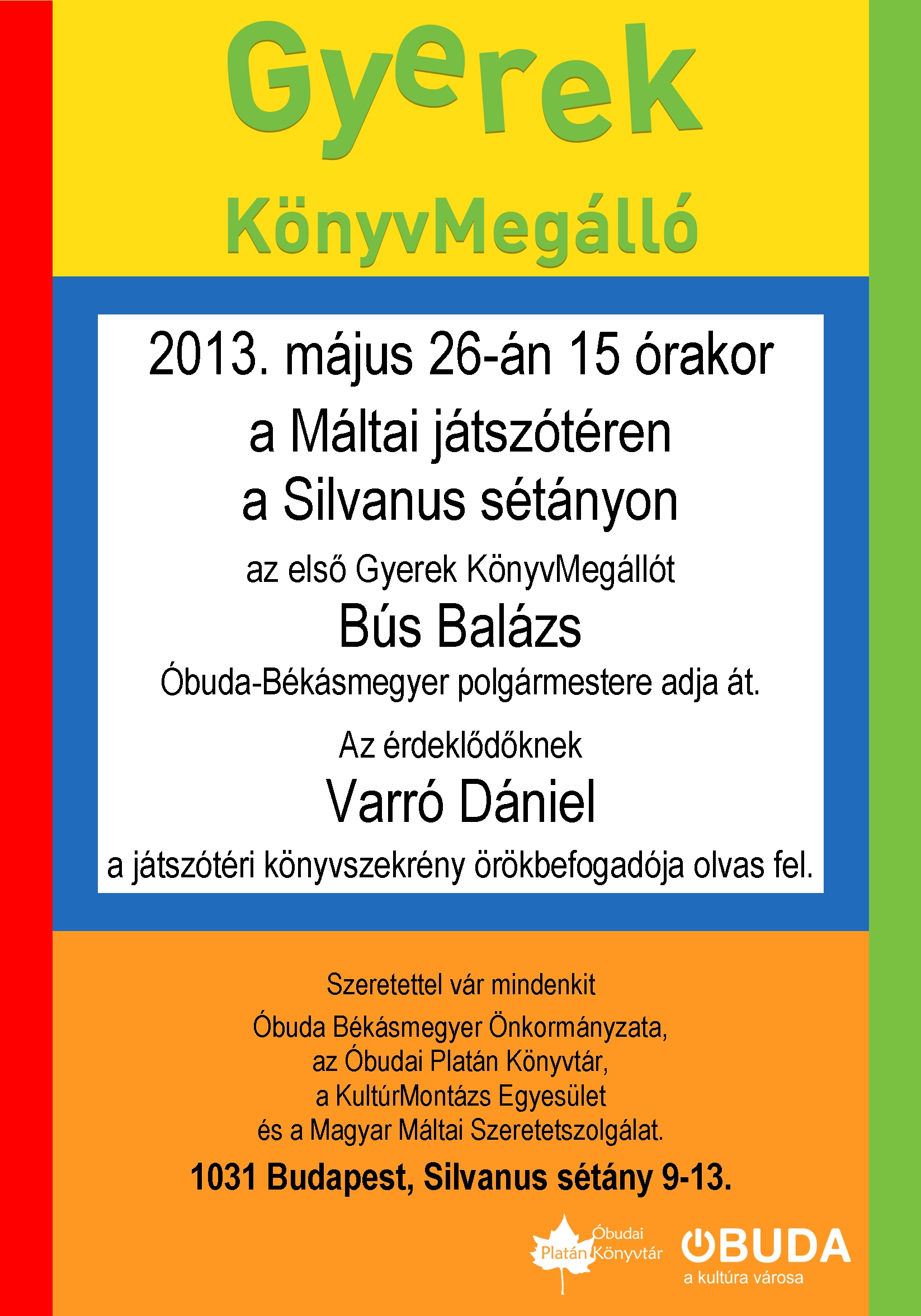 A Máltai játszótéren a Silvanus sétányon az első Gyerek KönyvMegállót Bús Balázs Óbuda-Békásmegyer polgármestere adja át. Az érdeklődőknek Varró Dániel a játszótéri könyvszekrény örökbefogadója olvas fel