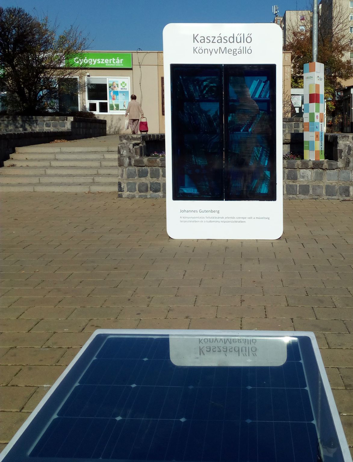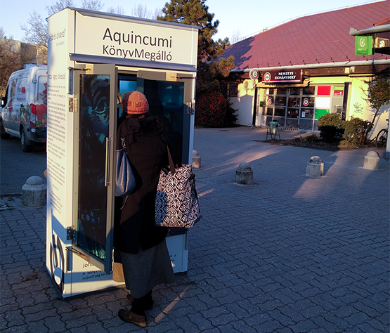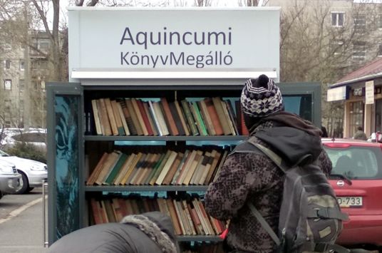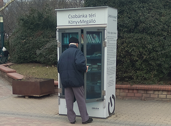 Az ingyenesen használható utcai könyves szekrényeket 2012-ben kezdte el Óbuda-Békásmegyer Önkormányzata, az Óbudai Platán Könyvtár és a KultúrMontázs Civil Egyesület a kerület forgalmas csomópontjaihoz telepíteni. Ma már a kerület öt pontján (Római tér, San Marco utca, Mátyás királyút, Csobánka tér, Kaszásdűlő) áll könyvmegálló, melyek a „Hozz egy könyvet, vigyél egy könyvet!” felhívással bátorítják az olvasást, könyveket kedvelőket a könyvcserére. A könyvmegállók olyan, a közösség által működtetett, bárki által elérhető pontok, amelyek az olvasás igényének feltámasztásán túl erősítik az egymásra figyelés, a kölcsönösség gondolatát, a közösségépítést. Mára olyan közösségi helyekké váltak, ahol a napi rutintevékenységen túl, a szokásos útvonalakon egy-egy pillanatra megállva beszélgetések indulnak. 2017-ben a reformáció ötszázadik és a könyvmegállók ötödik évfordulója alkalmából a szekrények egy évre ünnepi, évfordulós dekor fóliát kaptak.