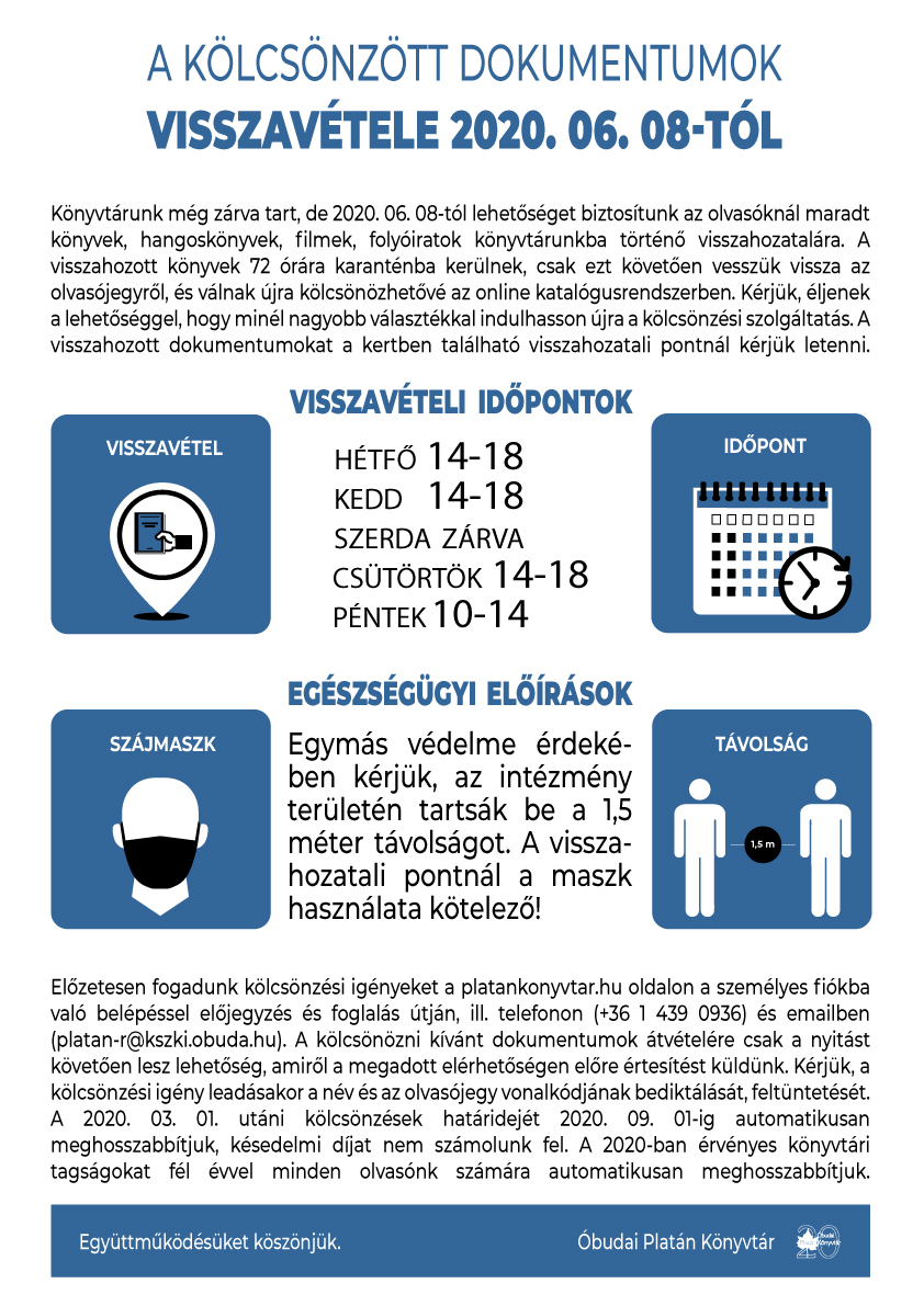 Az Óbudai Platán Könyvtár még zárva tart, de 2020. június 8-tól lehetőséget biztosítunk az olvasóknál maradt könyvek, hangoskönyvek, filmek, folyóiratok könyvtárunkba történő visszahozatalára. A visszahozott könyvek 72 órára karanténba kerülnek, csak ezt követően vesszük vissza az olvasójegyről és válnak újra kölcsönözhetővé az online katalógusrendszerben. Azért, hogy minél nagyobb választékkal indulhasson újra a kölcsönzési szolgáltatás, kérjük, éljenek a lehetőséggel. A visszahozott dokumentumokat a kertben található visszahozatali pontnál kérjük letenni.