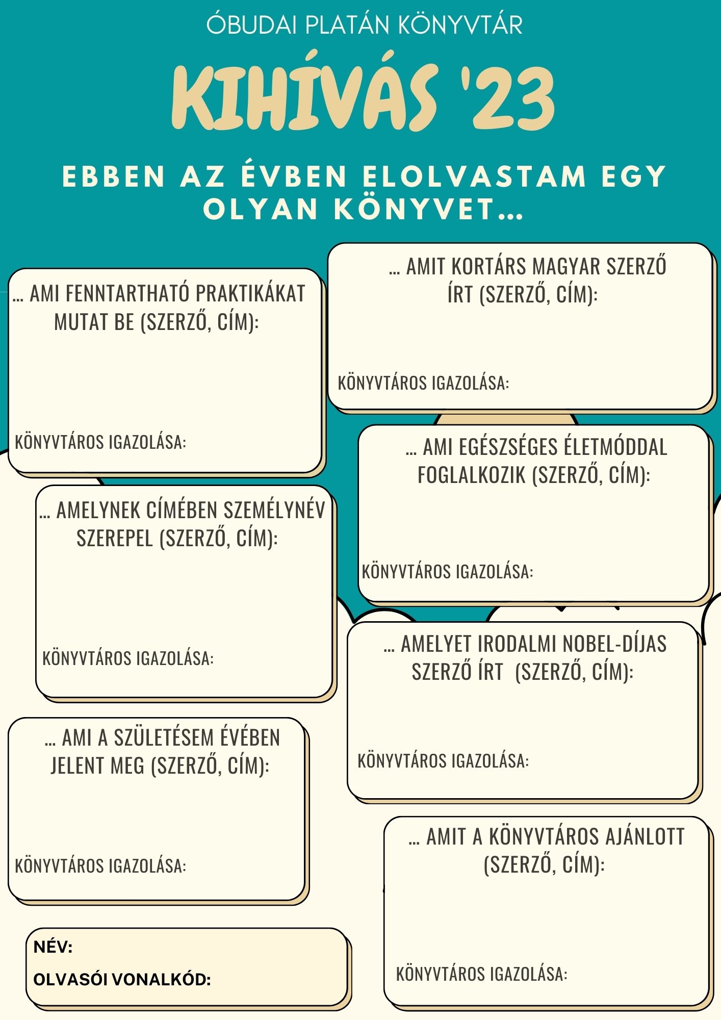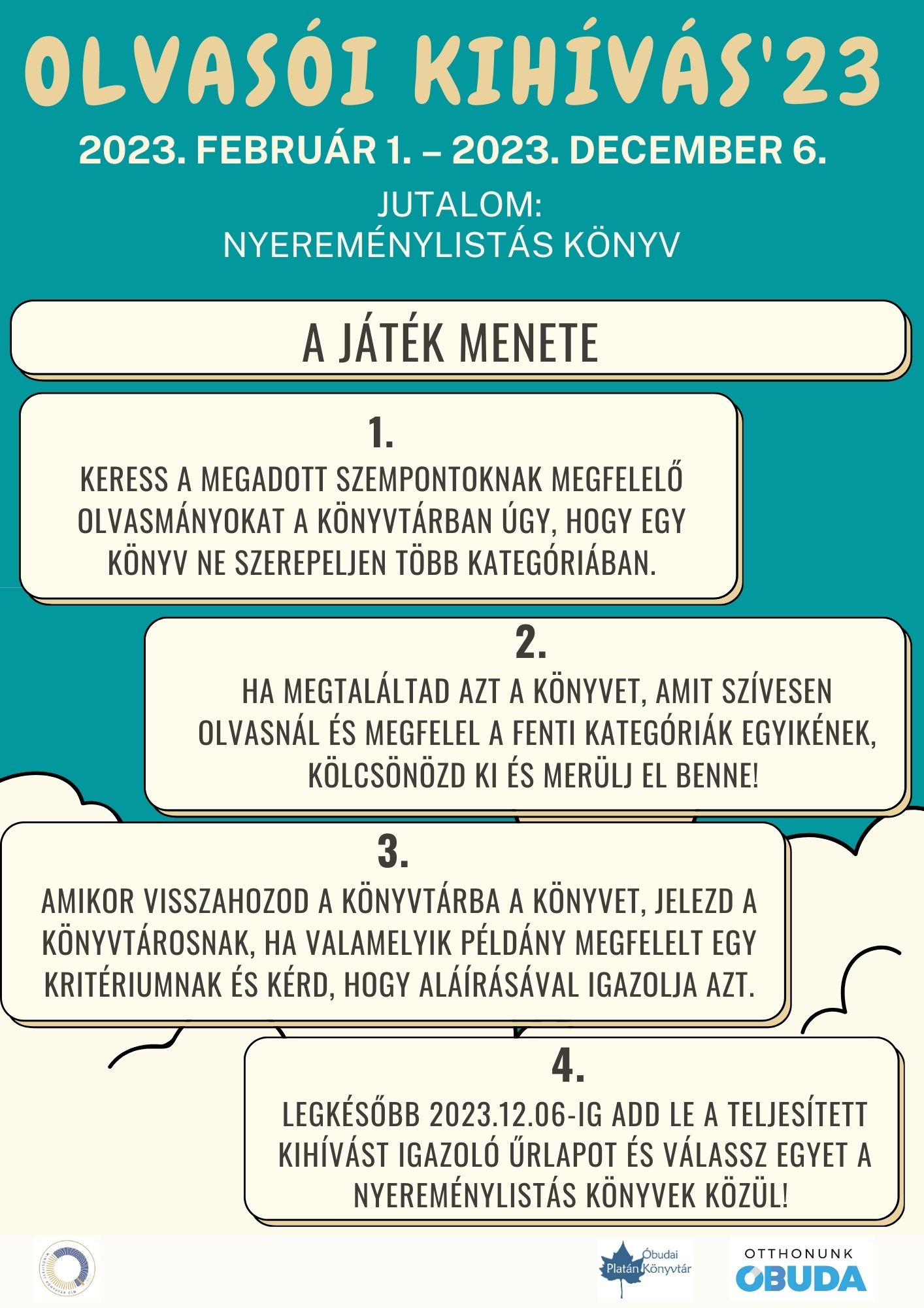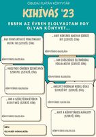 Keress a megadott szempontoknak megfelelő olvasmányokat a könyvtárban, úgy hogy egy könyv ne szerepeljen több kategóriában. Ha megtaláltad azt a könyvet, amit szívesen olvasnál és megfelel a megadott kategóriák egyikének, kölcsönözd ki és merülj el benne. Amikor visszahozod a könyvtárba a könyvet, jelezd a könyvtárosnak, hogy az adott példány megfelelt a megadott kritériumnak és kérd, hogy aláírásával igazolja ezt. Legkésőbb 2023. december 06-ig add le a teljesített kihívást igazoló űrlapot és válassz jutalomkönyvet a nyereménylistából!