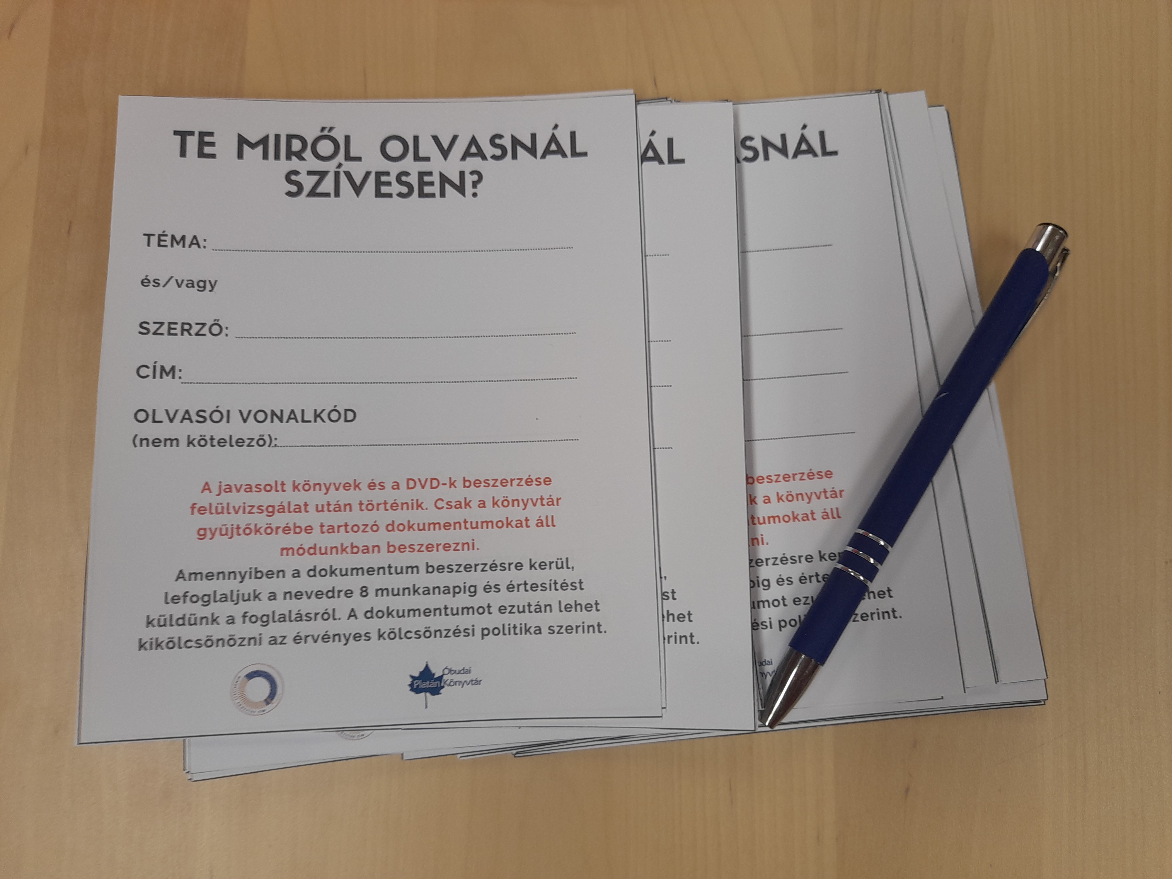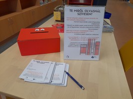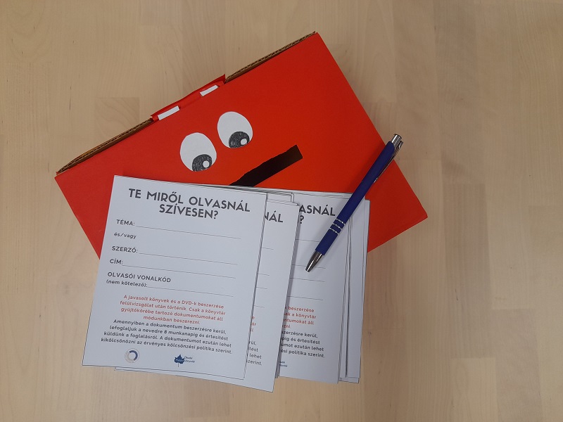 A könyvek, hangoskönyvek, dvd-filmek beszerzése során az egyik legfontosabb szempont könyvtárunkban, hogy olyan példányokat vásároljunk, melyeket olvasóink szívesen olvasnának. meghallgatnának, kölcsönözének. Ezért kihelyezésre került a könyvtárban egy olvasói kívánságdoboz.