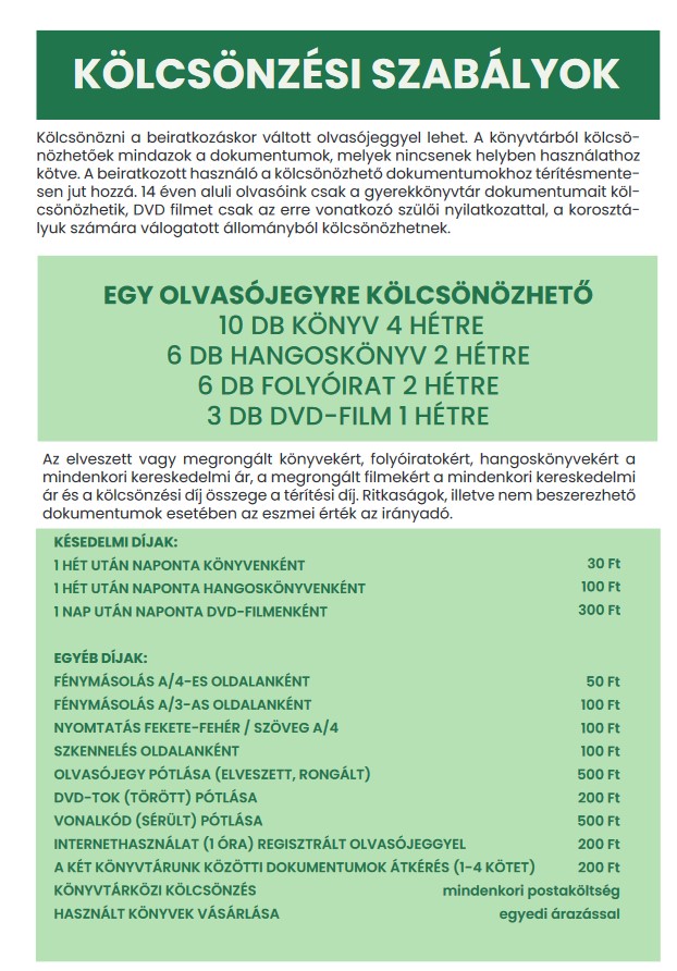 A 2024-es évre vonatkozó beiratkozási információkat/ feltételeket, a díjakat és a kölcsönzési szabályokat megtekinthetitek a lentebbi képeken.